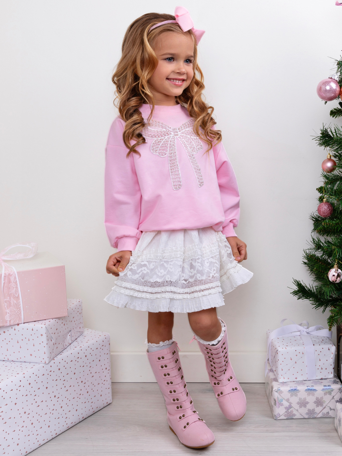 - Features a light pink sweatshirt adorned with a sparkling sequin bow appliqué at the chest for a charming, feminine touch.