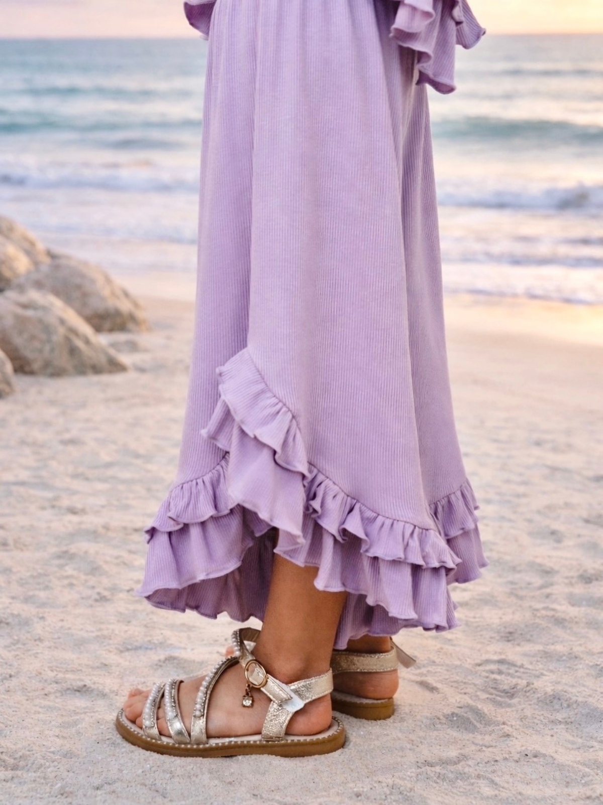 - Set includes sleeveless lilac-colored top with ruffle hem details and matching wide-leg pants with elastic waist and ruffle hem.