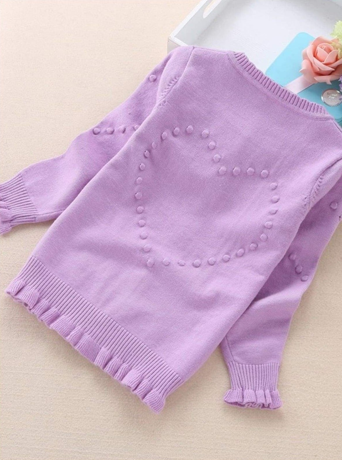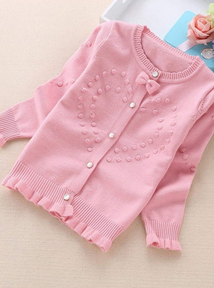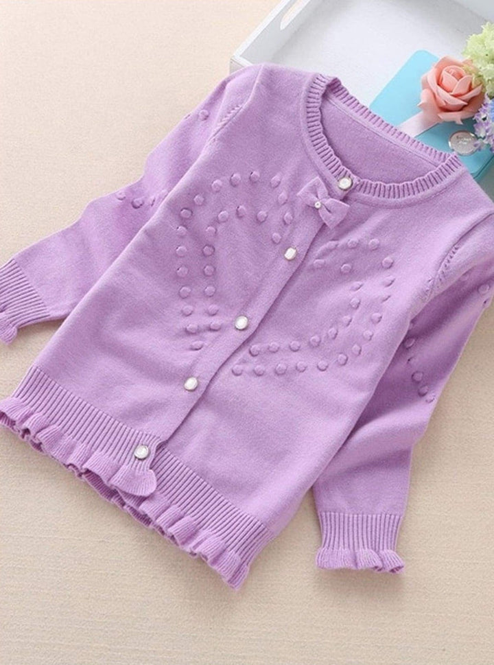 This knit cardigan has front buttons adorned with a bow and ruffle trim details. Your little girl will love the heart that forms on both the front and the back. It's the perfect layering piece to wear over her favorite tops this fall and winter.