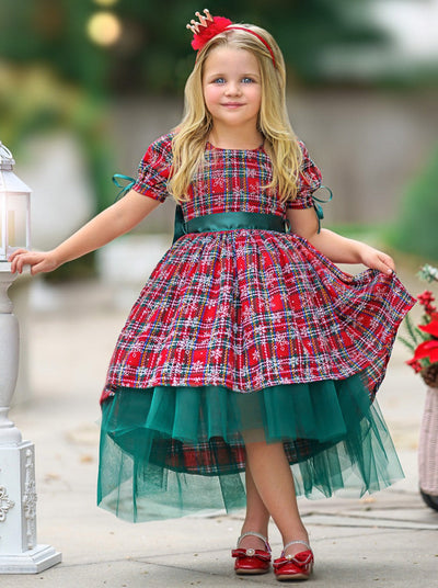 Red plaid holiday dress with snowflake print, tulle underskirt, and belt detail