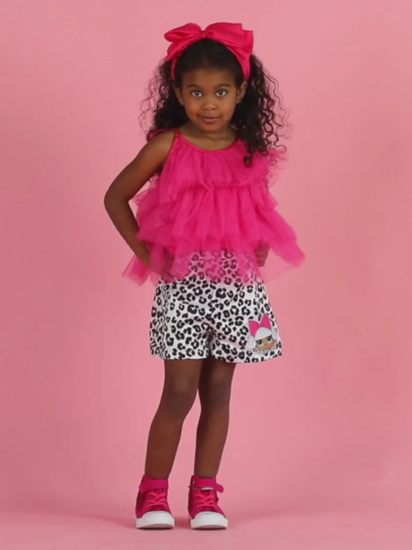 Fuchsia tiered ruffle top with adjustable shoulder straps and L.O.L. SURPRISE!™ Diva embroidered black-and-white satin cheetah print shorts