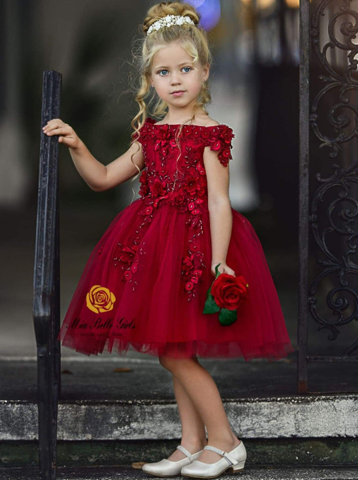 • She will be the talk of this year's family holiday card! This gorgeous dark red dress has an off-shoulder silhouette. Its also covered with flower appliques, and the tulle skirt is perfect for twirling in.