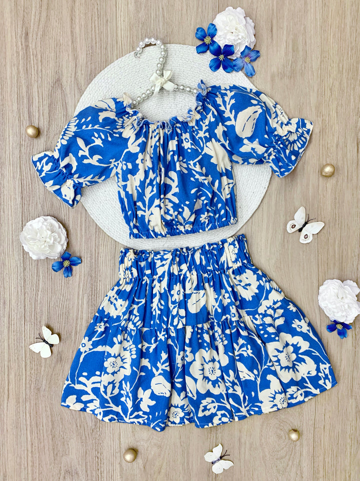 This two-piece outfit features a charming smocked top with ruffle sleeves and a matching flowy skirt, both showcasing a stunning indigo floral print on a cream backdrop.