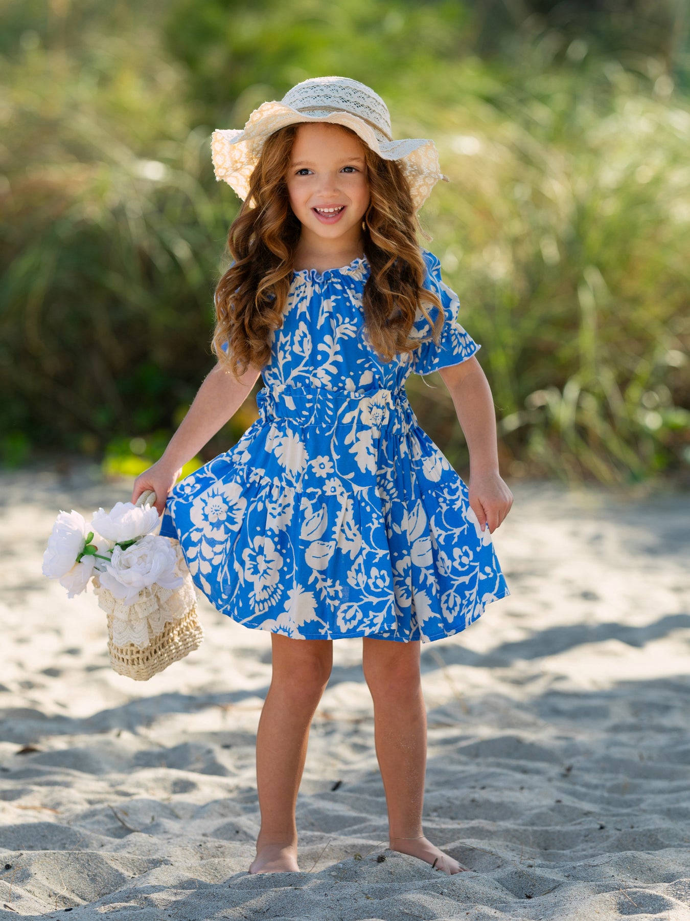 The elasticized neckline and waistband ensure a secure and comfortable fit, making it easy for her to twirl through the day in style. A must-have for her spring and summer wardrobe!