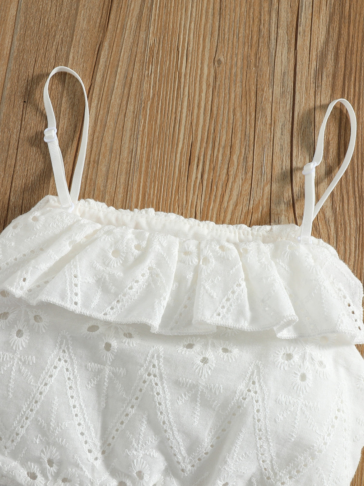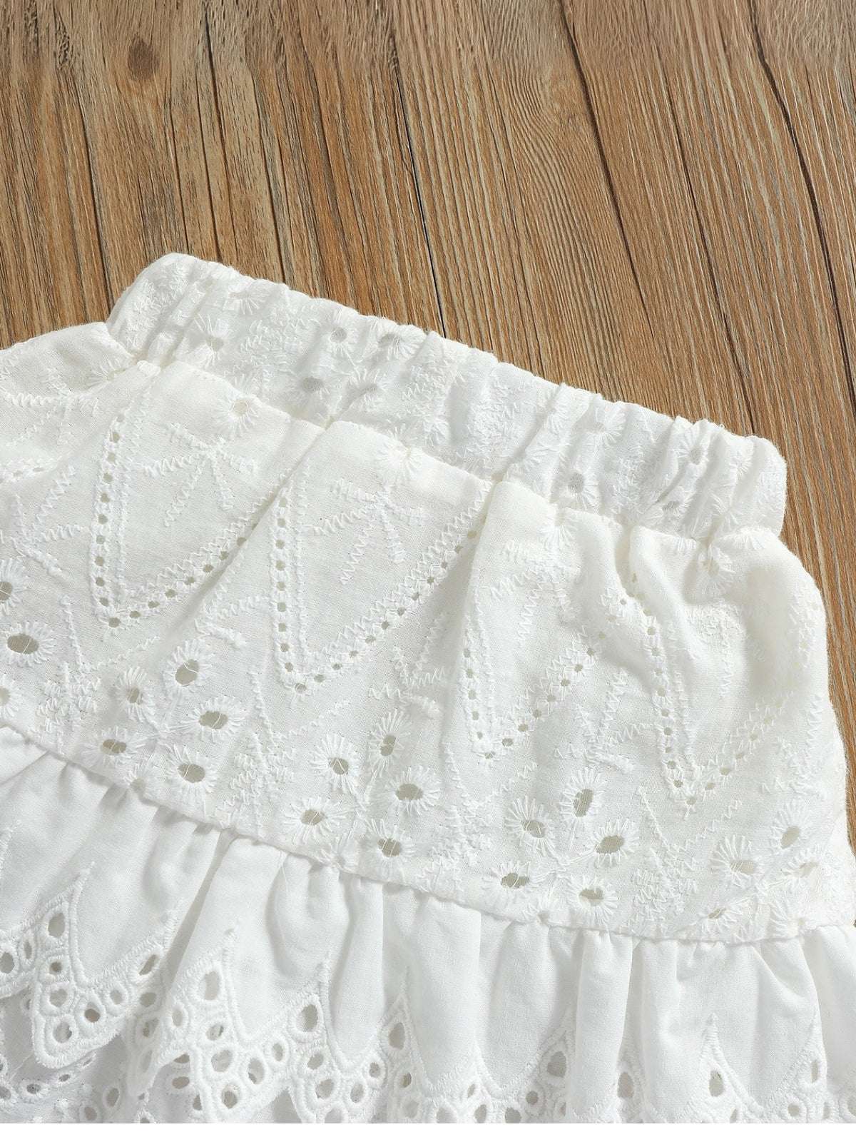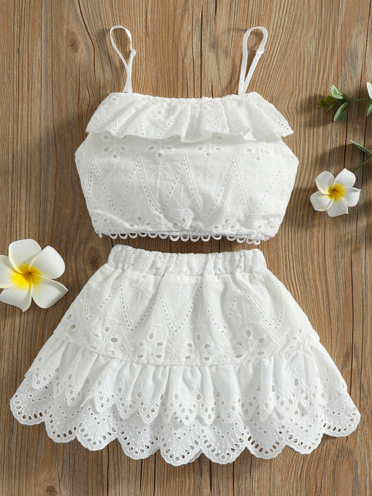 • Adorable white lace ruffle camisole and high-waist skirt set for girls. Made from soft cotton with a floral eyelet design, perfect for summer casual wear!