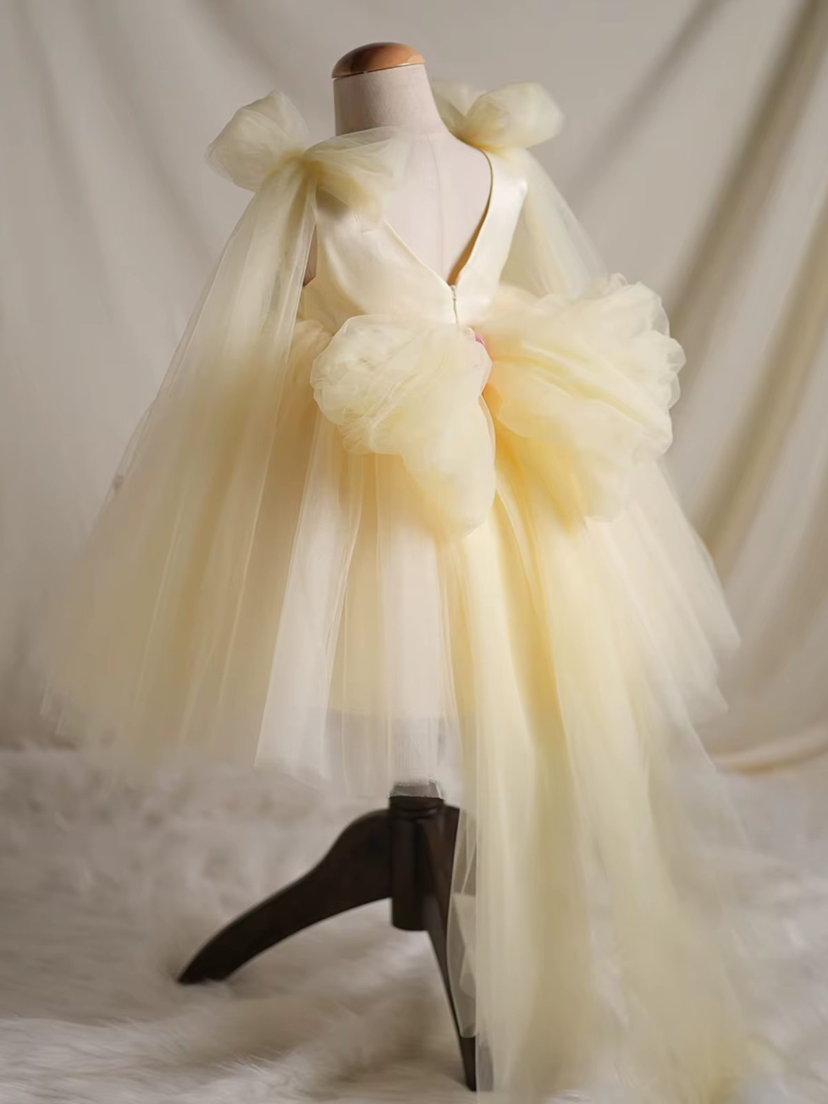 Elegant bow accents and layered tulle add volume and sophistication, perfect for twirling.