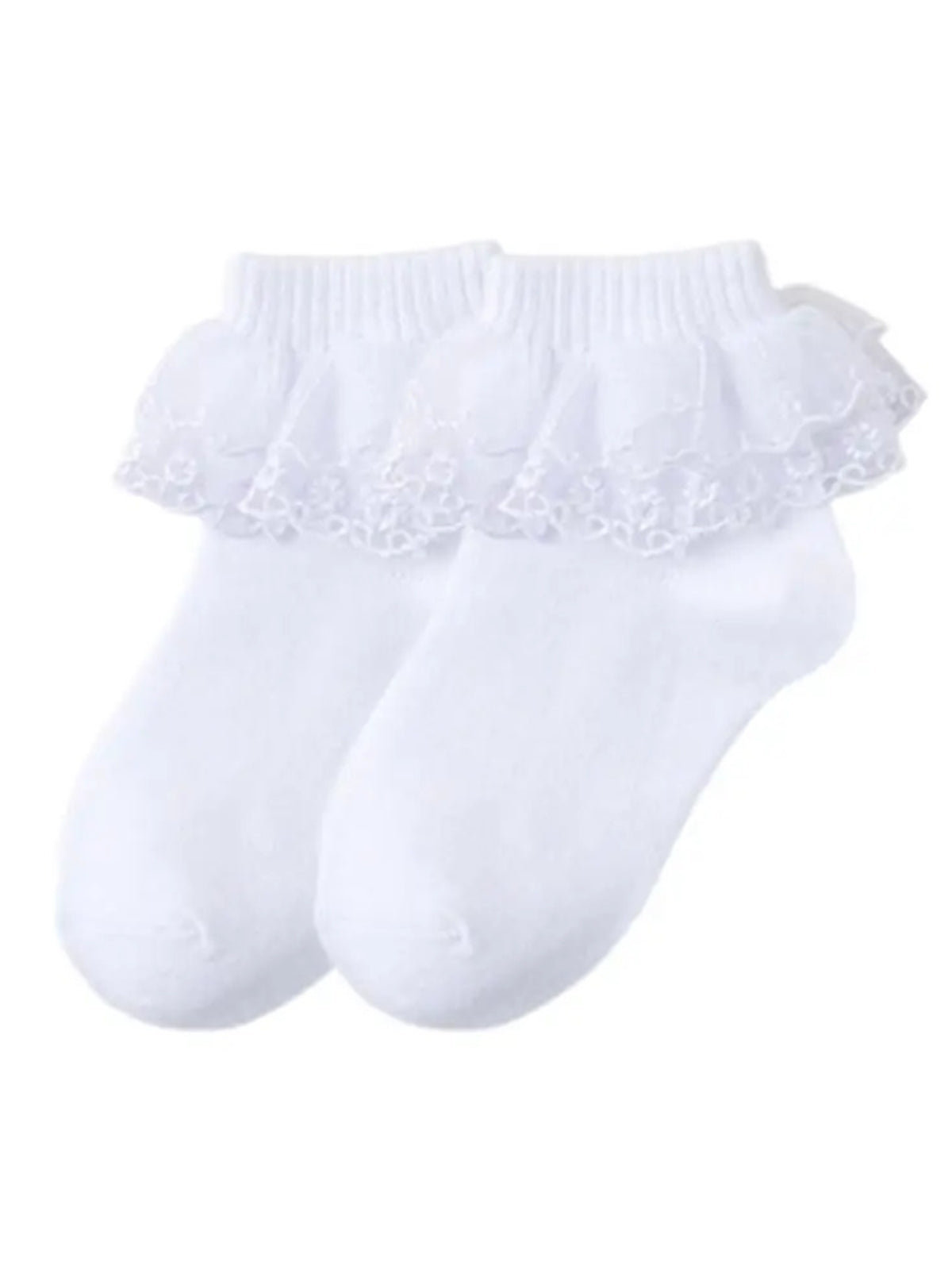 Complete your little one’s outfit with this elegant white princess-style ankle sock, featuring delicate lace ruffles for a timeless, dainty look. Made from soft, breathable cotton, it’s as comfortable as it is charming.