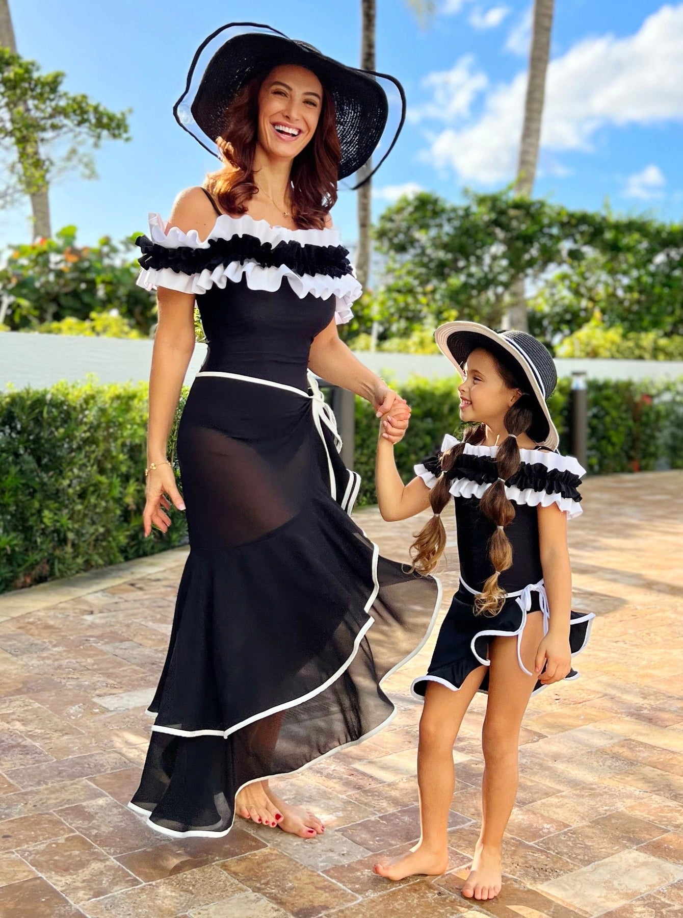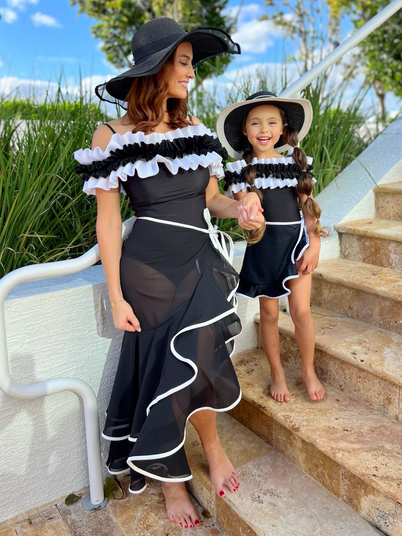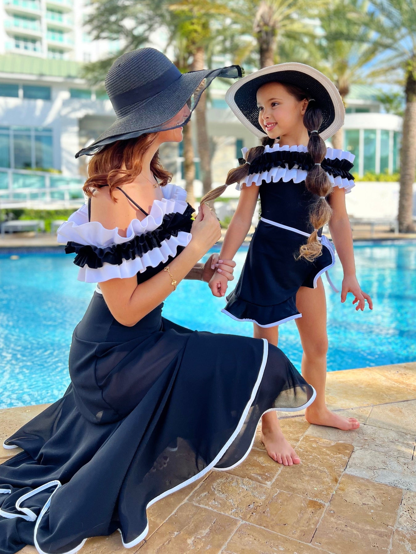 - Sweet summers are made with our Mommy And Me black ruffle shoulder one-piece swimsuit. White trim, statement ruffles, and a timeless color make for the perfect combo of cute and elegant. Get ready for picture-perfect moments with your mini me!