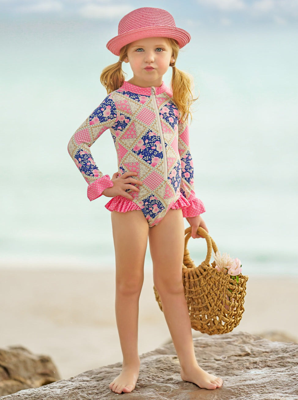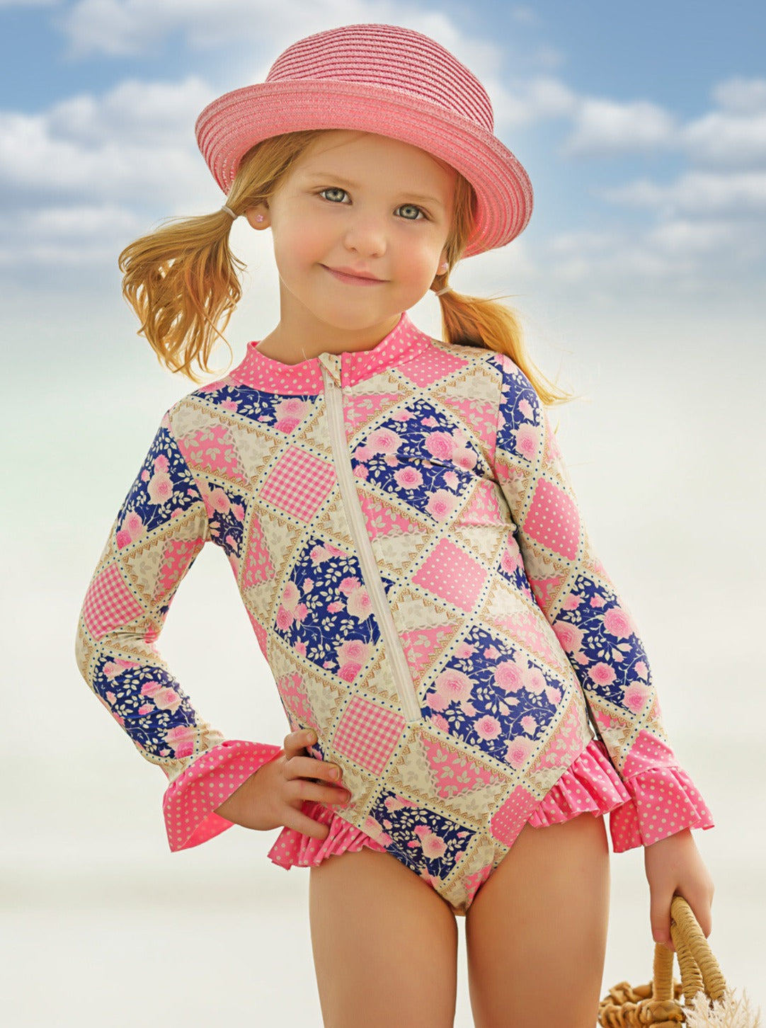 • Floral patchwork print long-sleeve one-piece swimsuit with a collar, 1/2 front zipper, ruffle cuffs, and trim