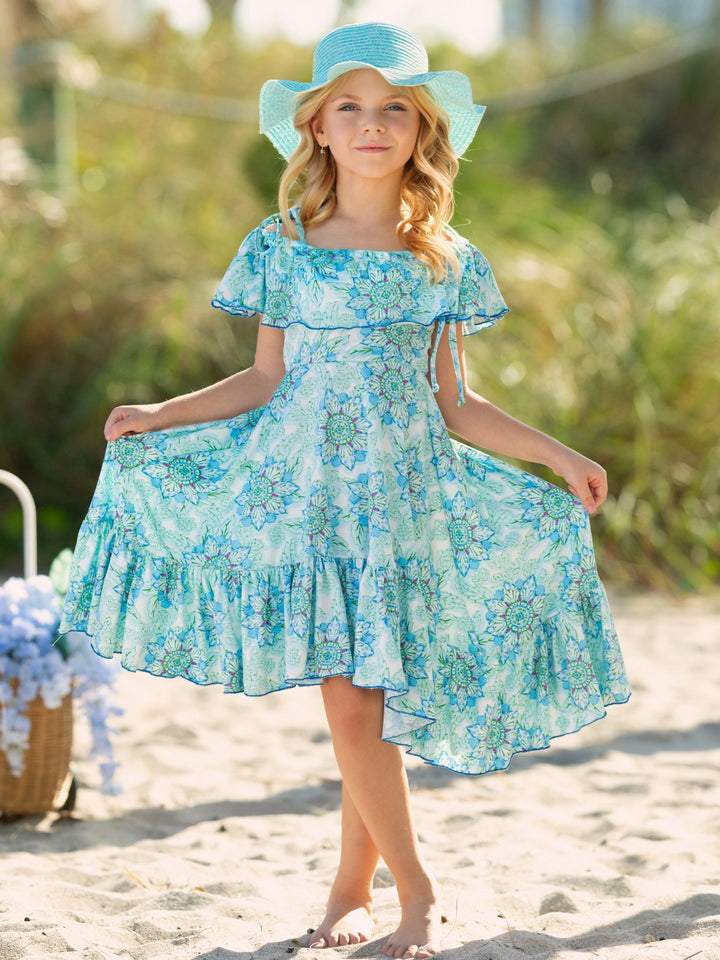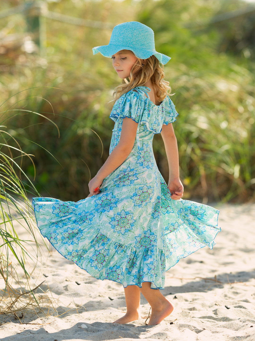 - Featuring a captivating floral print in shades of blue, this dress showcases a statement ruffled neckline with tie straps for a customizable fit. The tiered, flowy skirt adds playful movement, making it ideal for twirling at family gatherings, beach photoshoots, or garden parties.