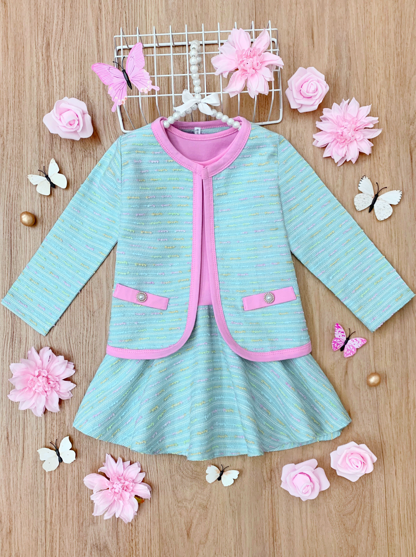 It's time for a preppy style twist! Our tweed blazer and dress set oozes sophistication mixed with a little bit of fun. Guaranteed to make your little girl look extra fashionable and confident. Simple, chic, and almost too cute for the classroom!