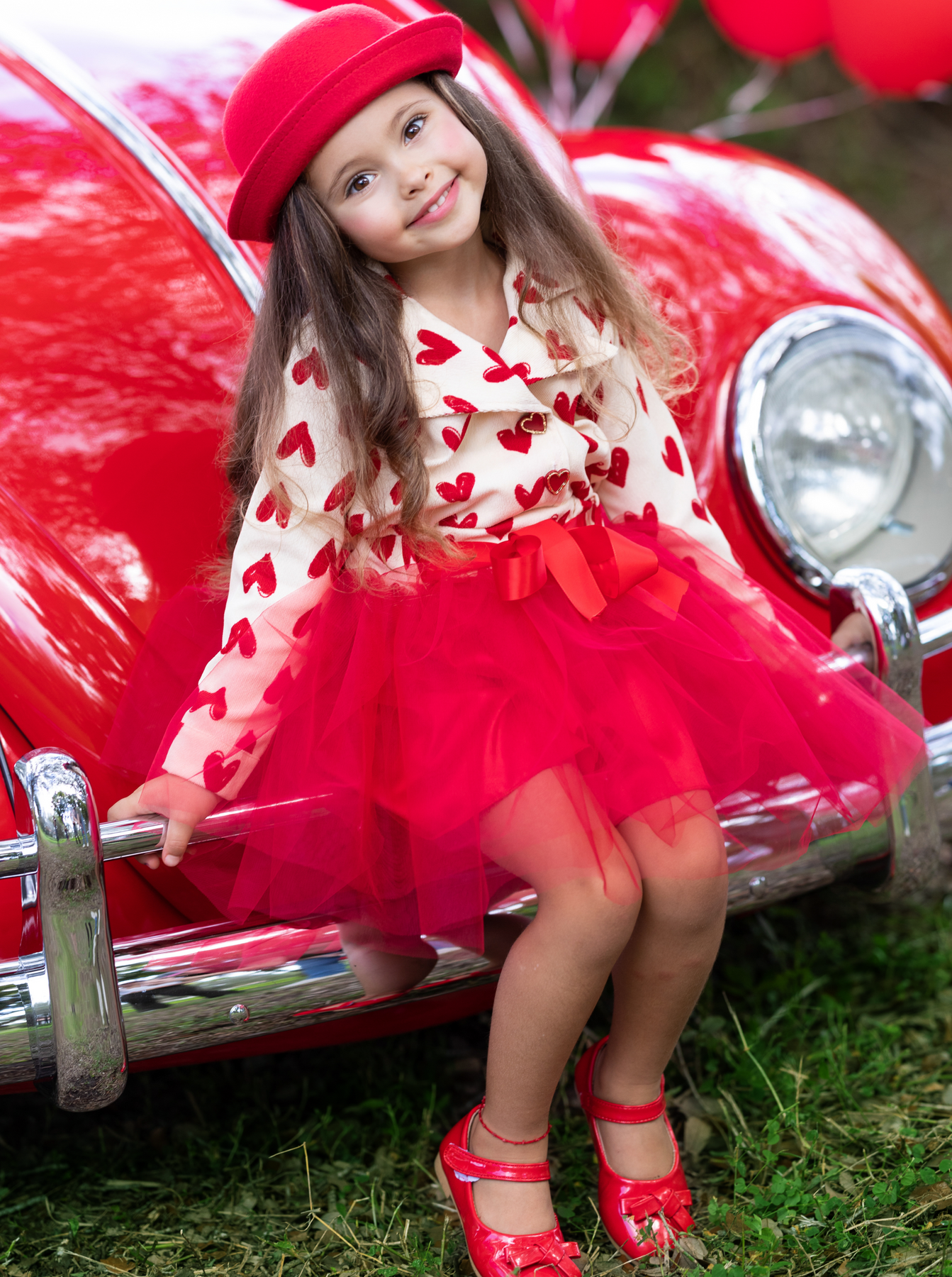• Corduroy blazer-style heart print bodice tutu dress with heart buttons, front satin bow tie, and layered mesh skirt