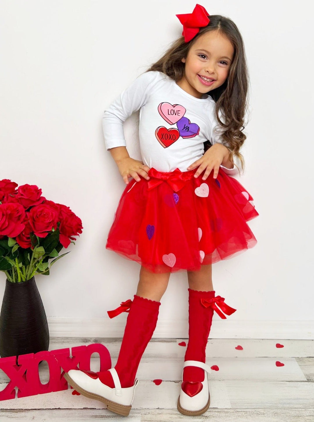- White long-sleeved top with "Love Ya XOXO" graphic print and a tutu skirt with glitter heart appliques