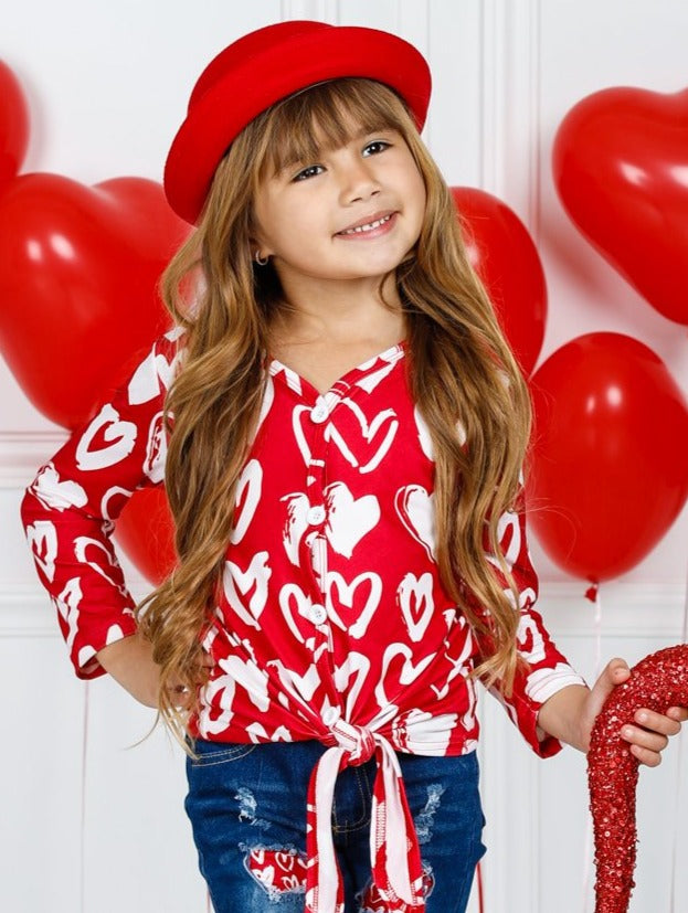 Girls Button Down Heart Print Knot Top - 2T / Red - Girls Fall Top