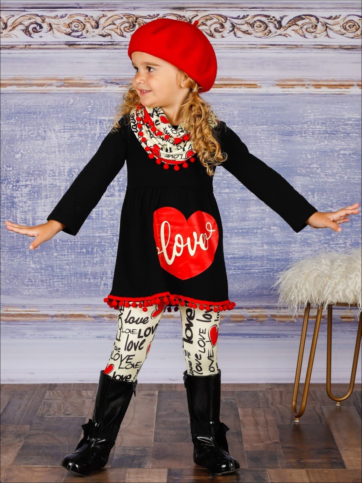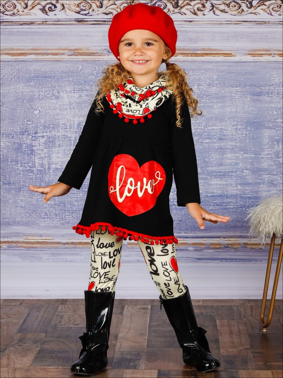 • Black tunic, "Love" heart print, red tassel hem, "Love" print leggings, and matching infinity wrap scarf