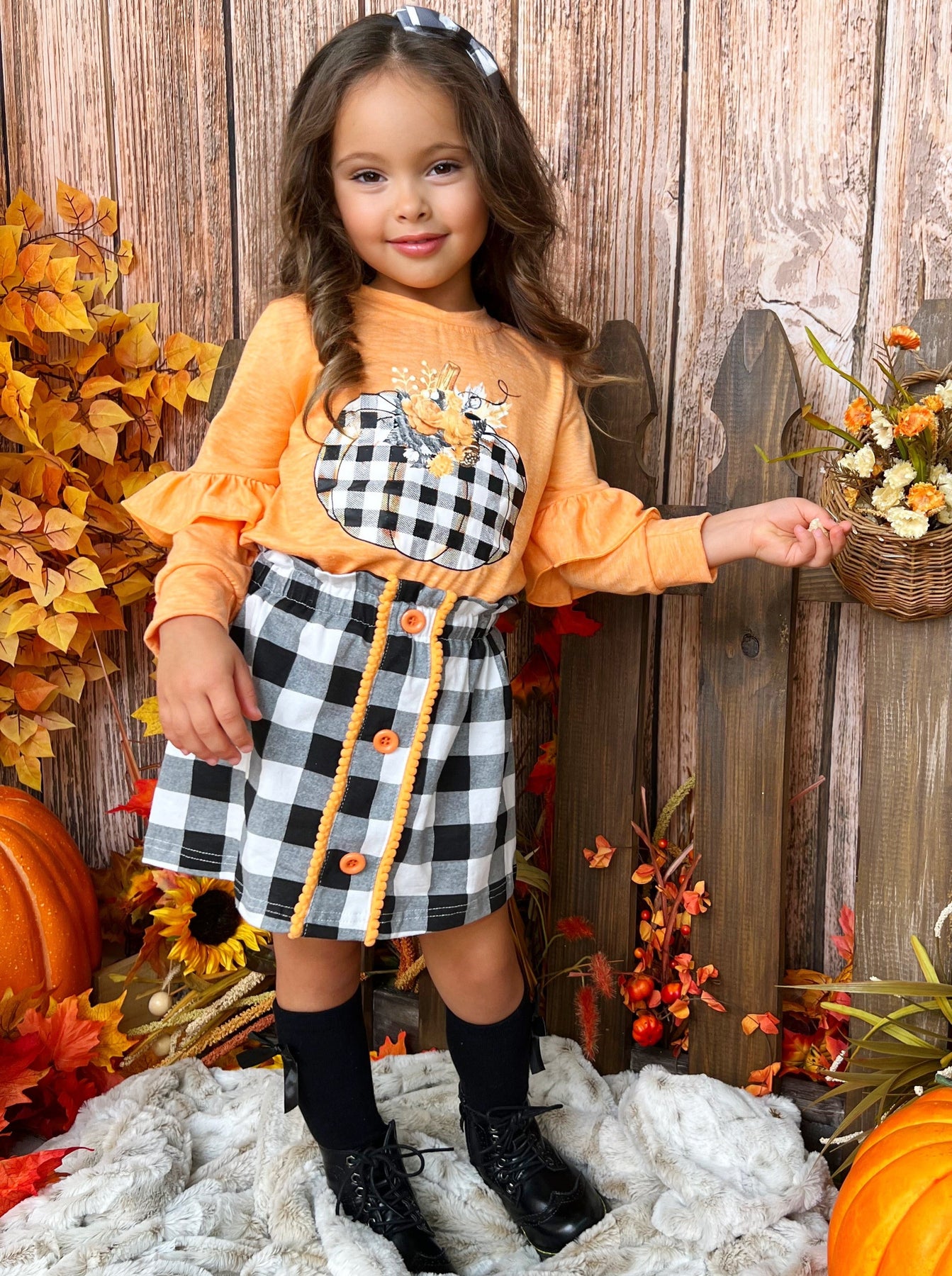 It's time to (pumpkin) spice up your little learner's cold-weather wardrobe! Prep your girl for chilly school days with the stylish protection of this chic plaid pumpkin skirt set.