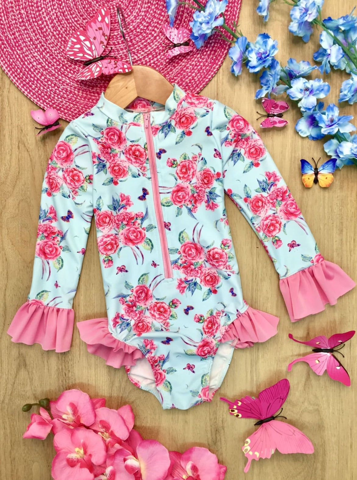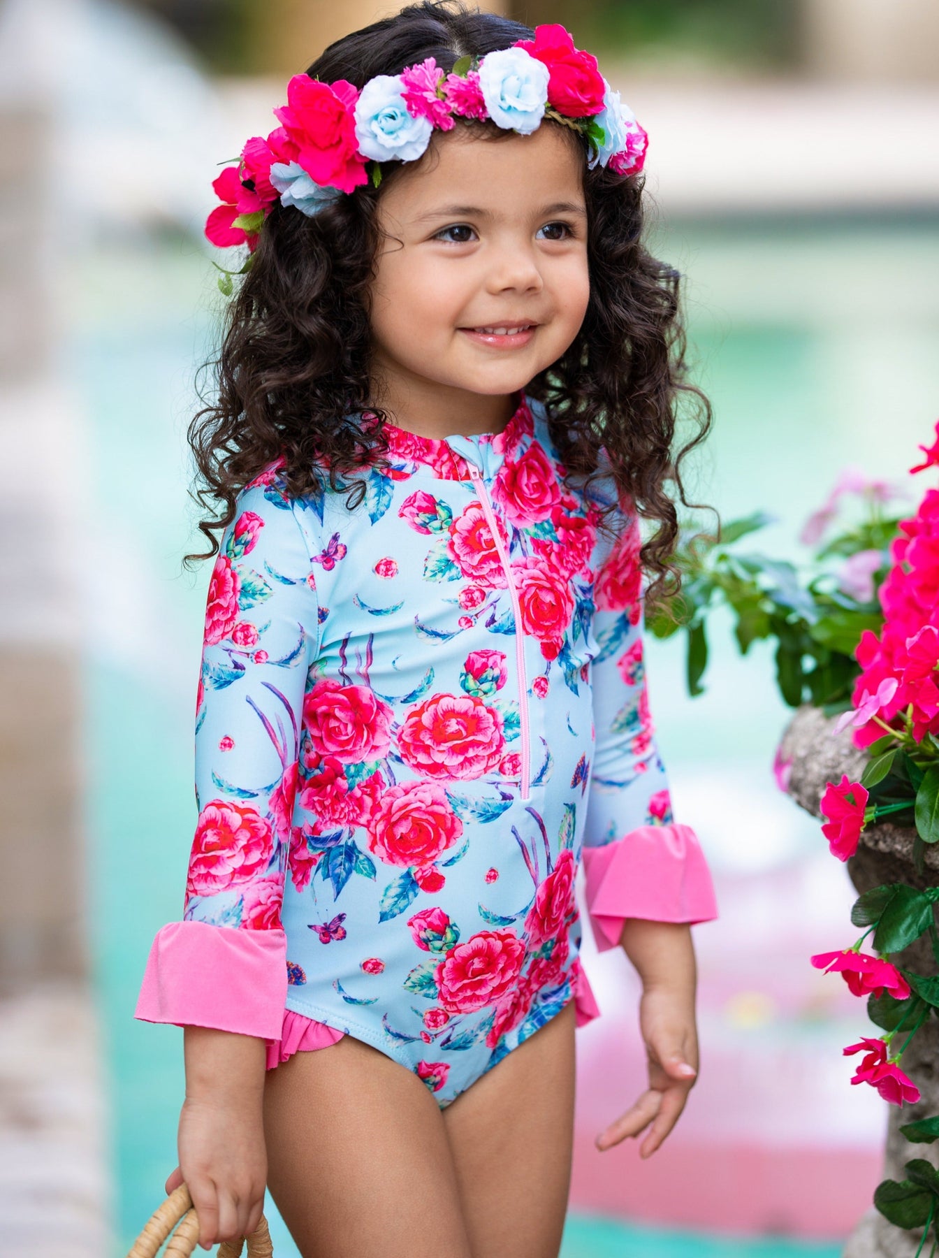 Toddler Rash Guard Swimsuit | Girls Floral Ruffled One-Piece Swimsuit
