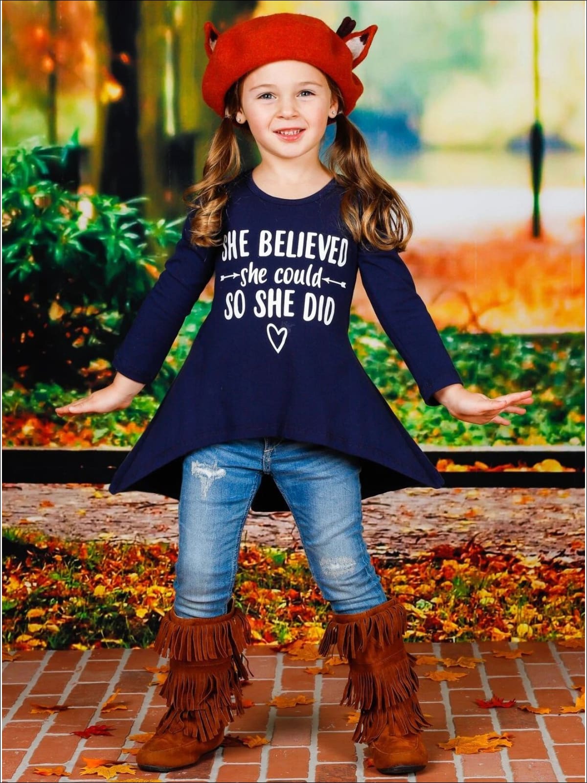 Girls She Believed She Could So She Did Hi-Lo Long Sleeve Graphic Statement Top - Navy / 2T/3T - Girls Fall Top