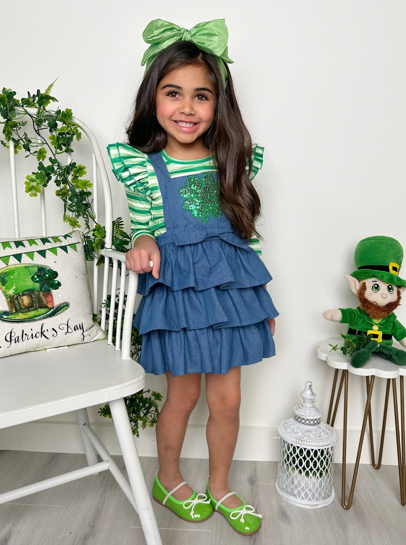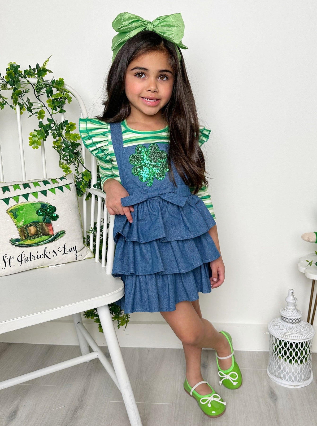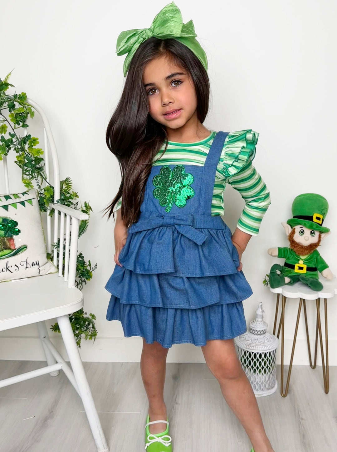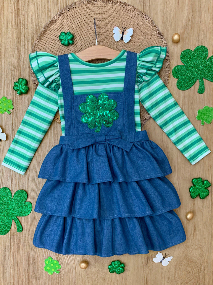- Turn your little girl into a clover-covered cutie in our St. Paddy's Day denim overall dress and long-sleeve top set. With striking stripes, playful ruffles, and head-turning sequined shamrock detail, this adorable pairing is perfect for celebrations and picture-perfect moments.