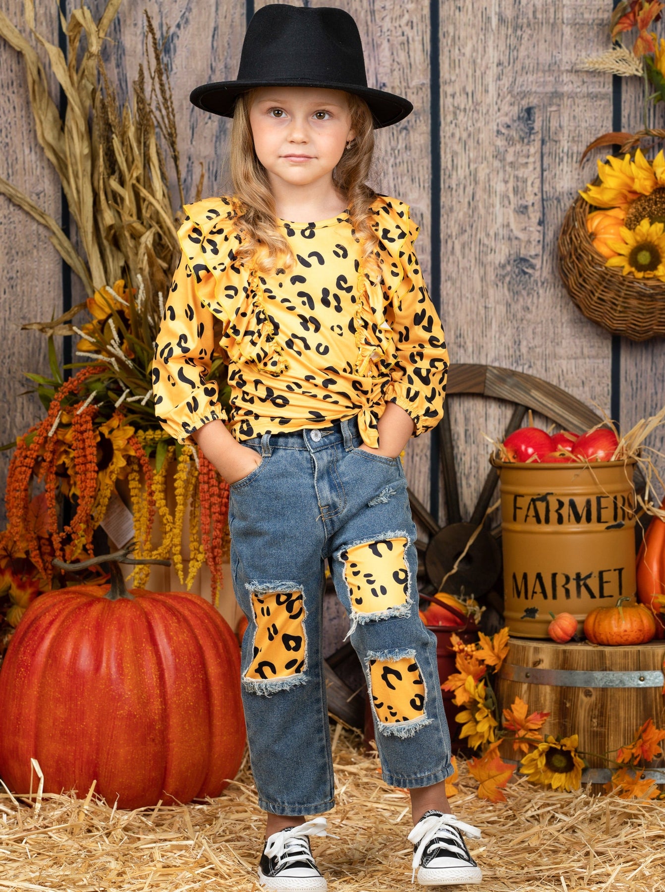 - Long-sleeved yellow leopard print top with ruffle shoulders and matching patched jeans