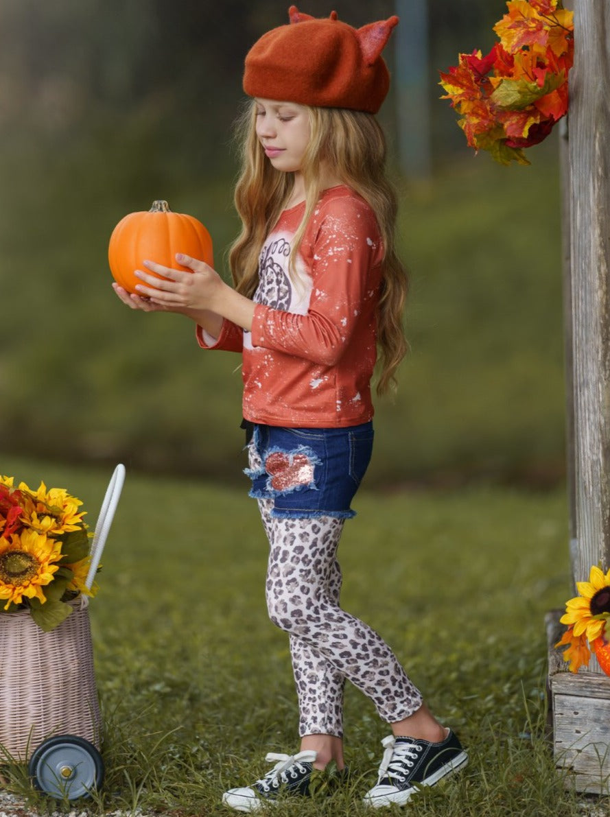 Posh Pumpkin Top, Patched Denim Shorts and Legging Set