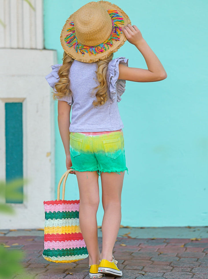 Kids Spring Outfit | Girls Kitten Graphic Tee & Ombré Denim Shorts Set