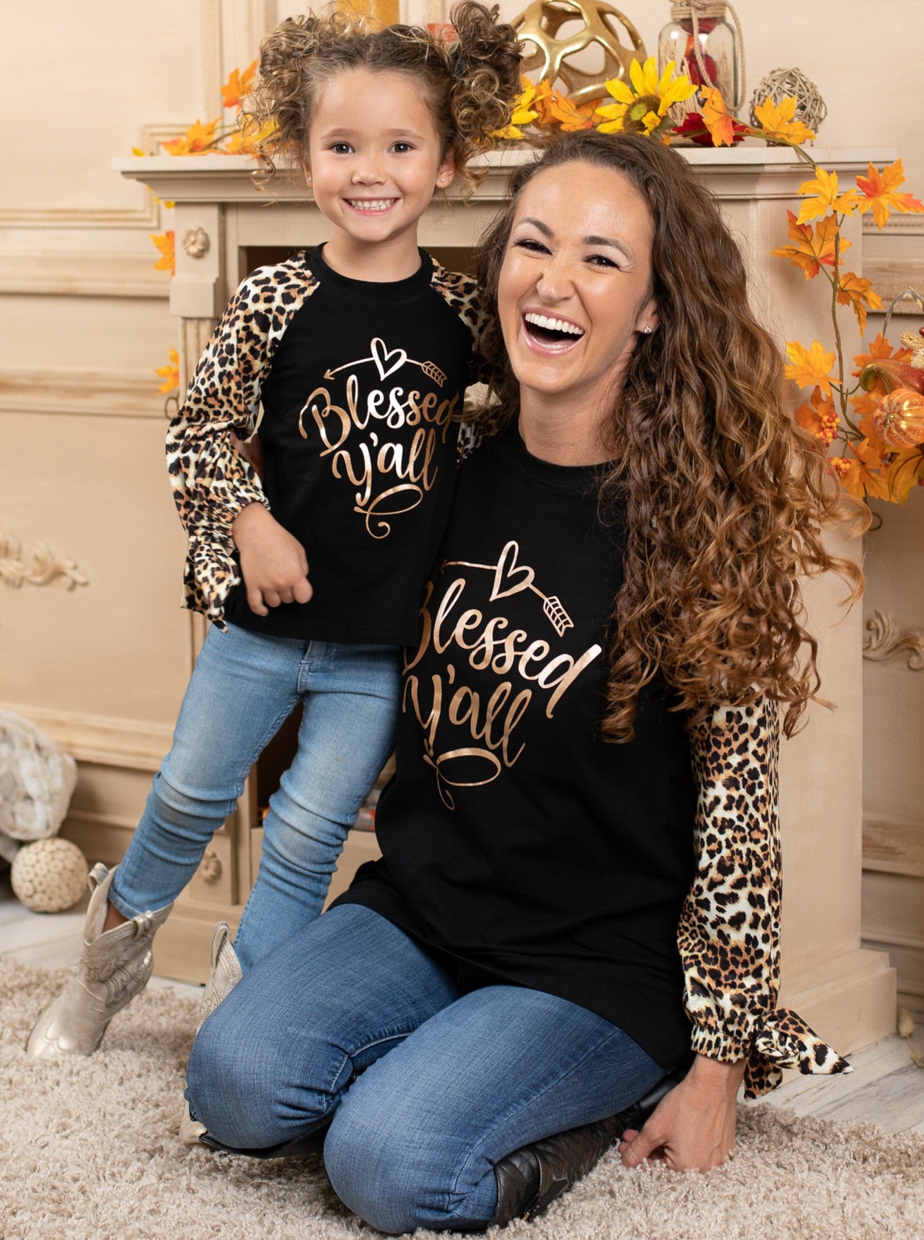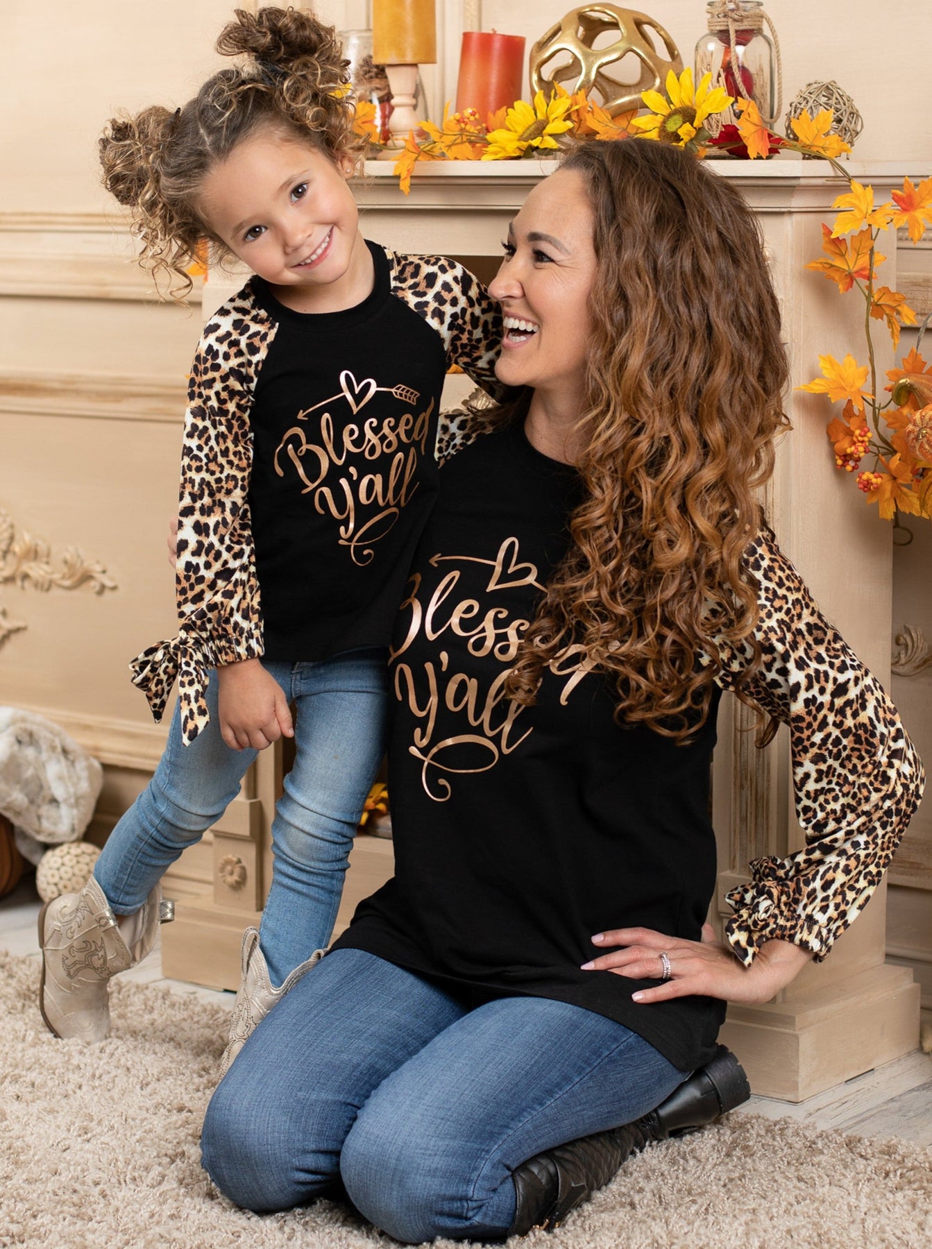 Be blessed and cherish the MOM-ent with our mother-daughter leopard raglan sleeve tops. Cute ties come at the end of the cuffs for added flair to go with the beautiful bronzed graphic design.