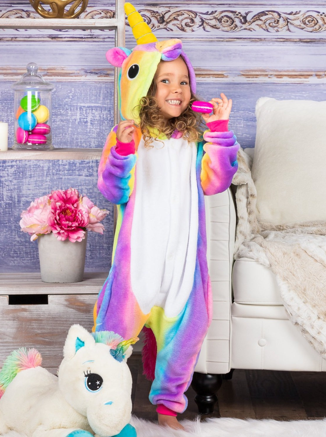 Long-sleeve pastel rainbow unicorn snap button-down onesie pajamas with pockets, unicorn hoodie, and tail