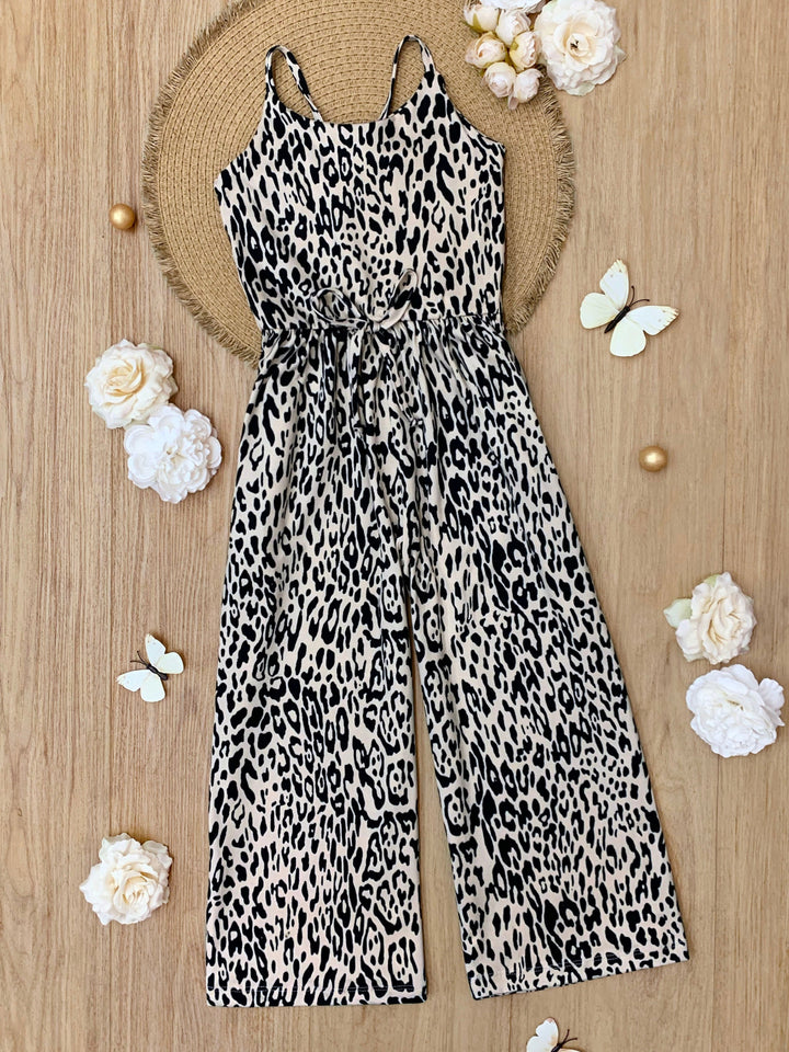 Cheetah print wide-leg jumpsuit with elastic waist tie