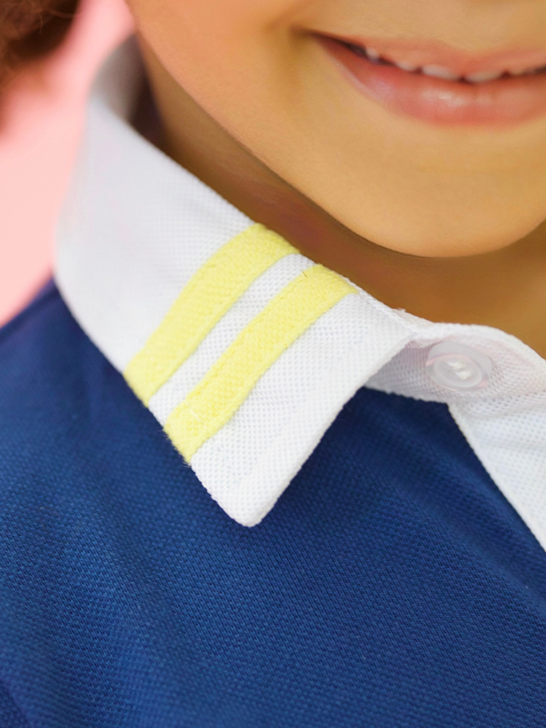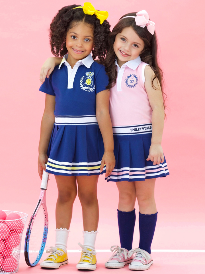 Add a pop of playful charm to her wardrobe with this SmileyWorld navy pleated dress designed for mini trendsetters. Featuring a crisp white collar, cheerful Smiley crest, and retro-inspired stripes, it’s the perfect mix of sporty prep and everyday cute. Whether she's heading to a birthday party or just out spreading smiles, this comfy polo dress brings energy and style to every move.