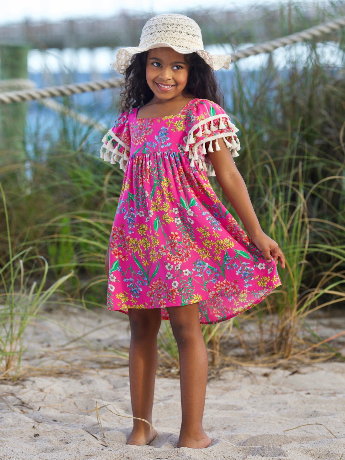Features charming tassel-trimmed flutter sleeves for a boho-chic touch.