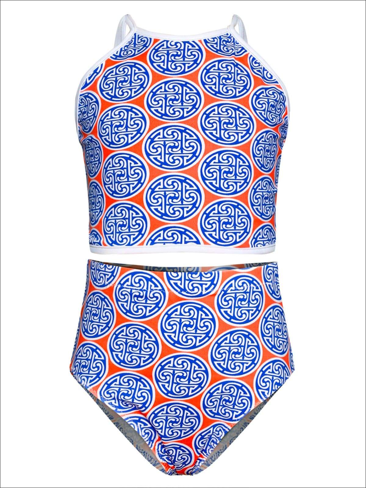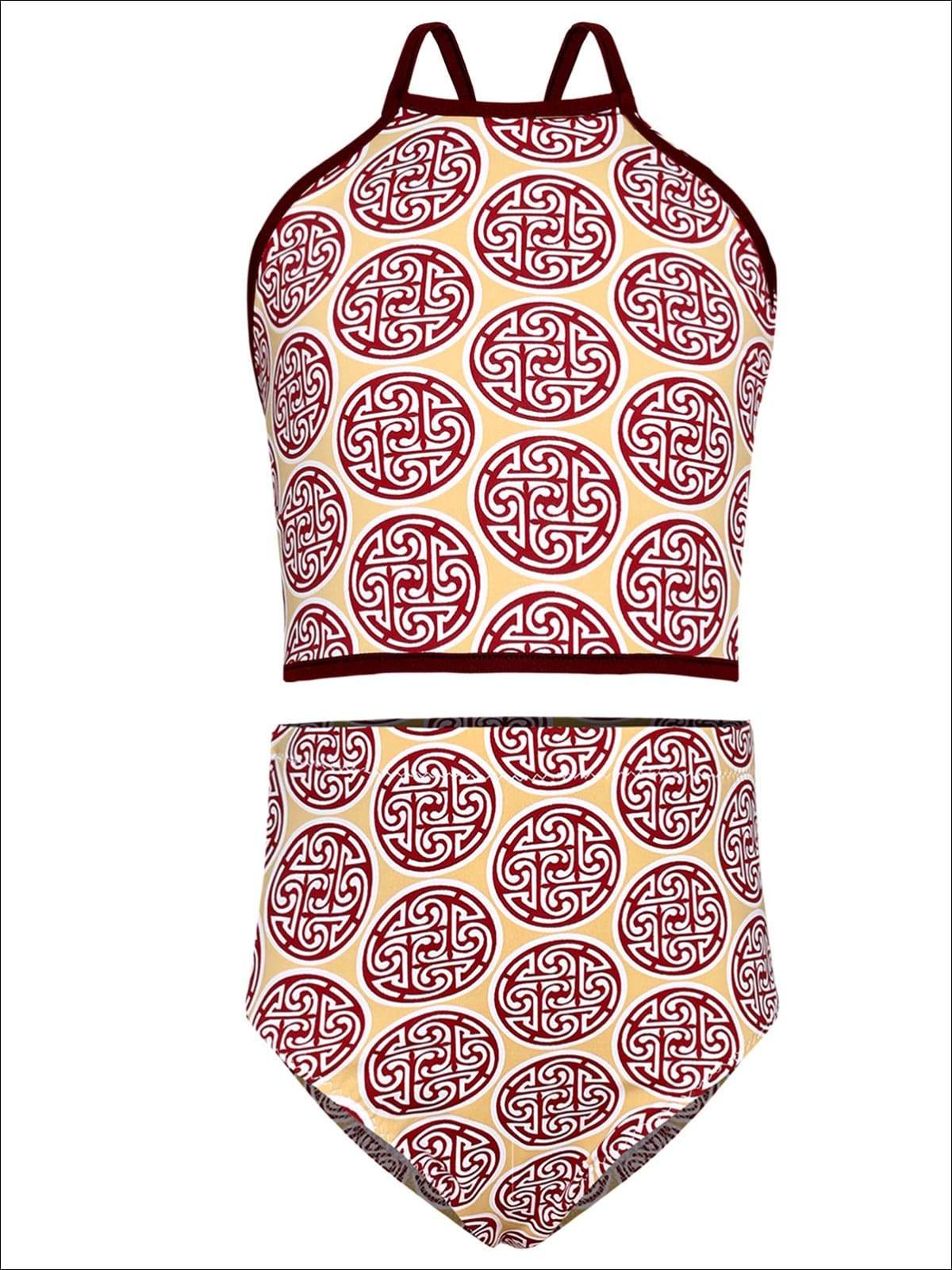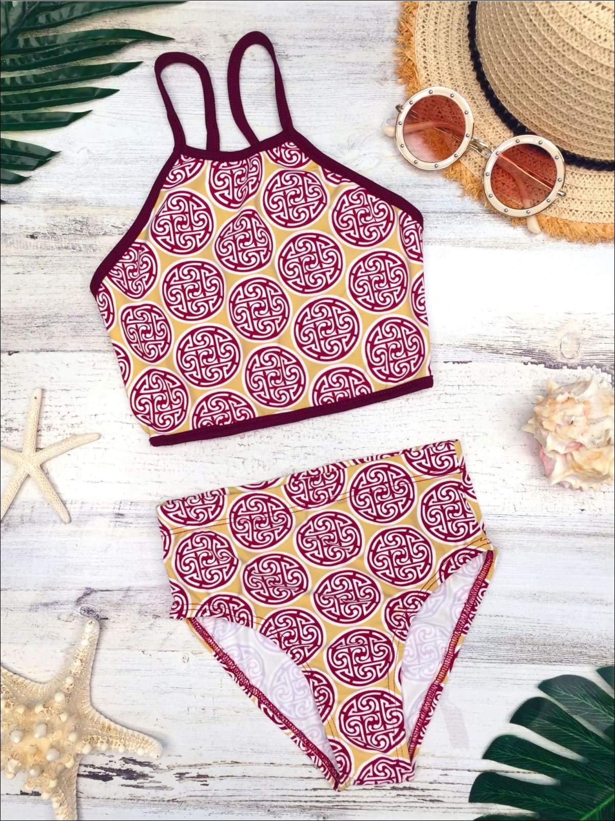 Two-piece halter top high-waisted swimsuit with Mandela print