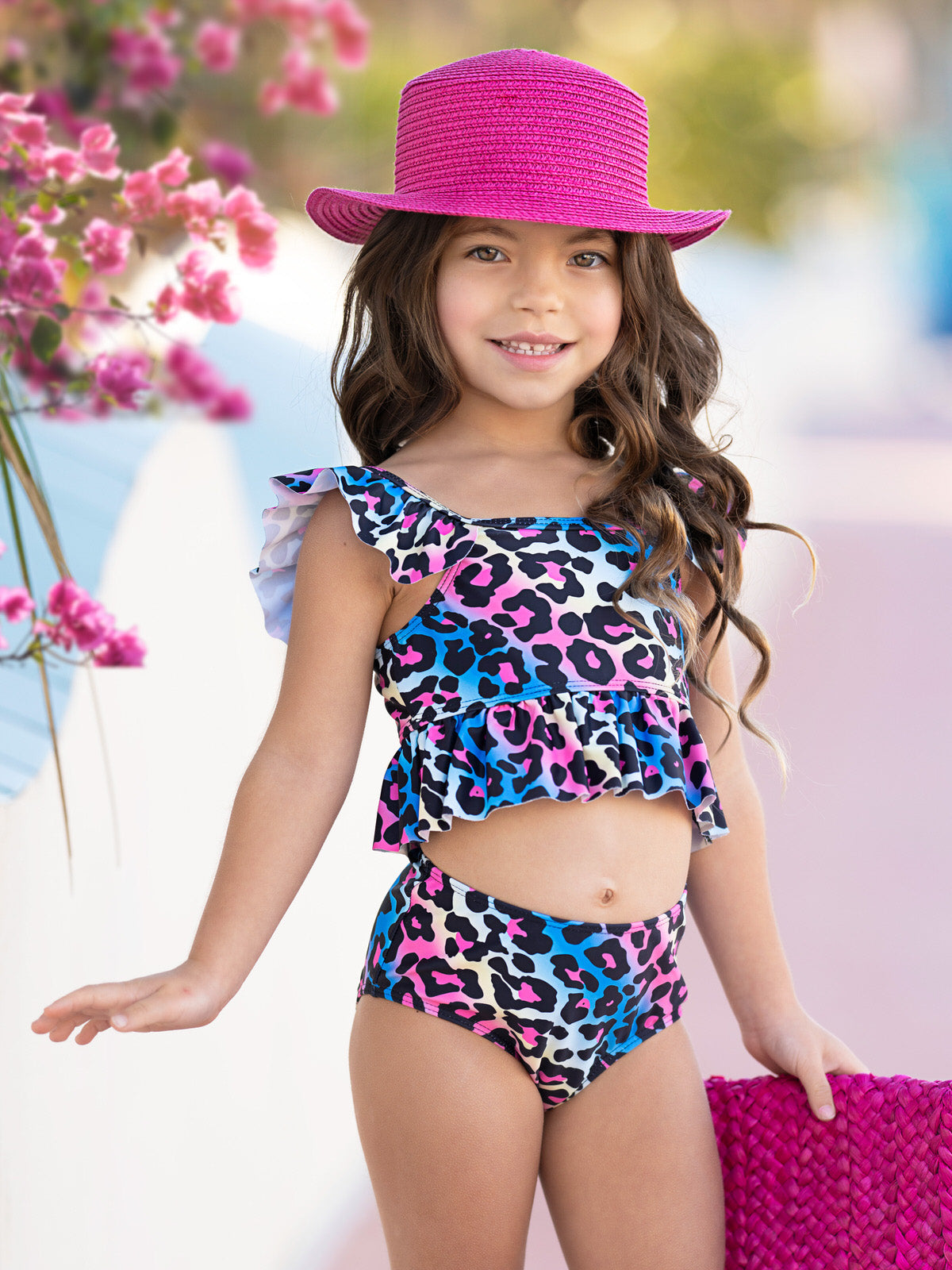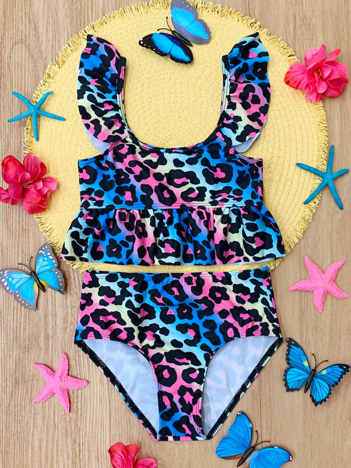 Unleash her bold style with the Wild Waves Leopard Ruffle Two-Piece Swimsui