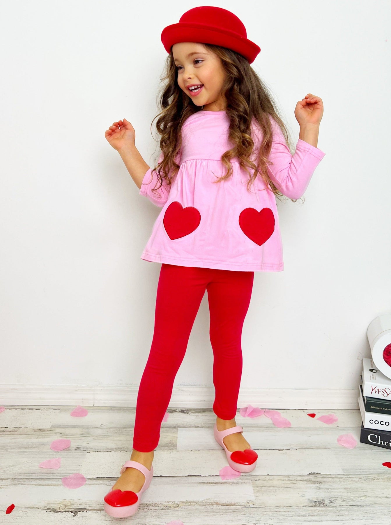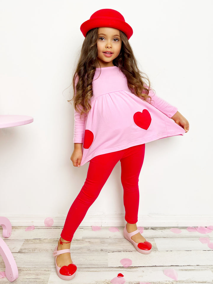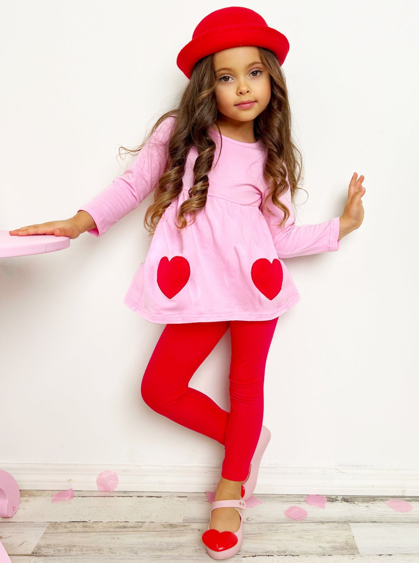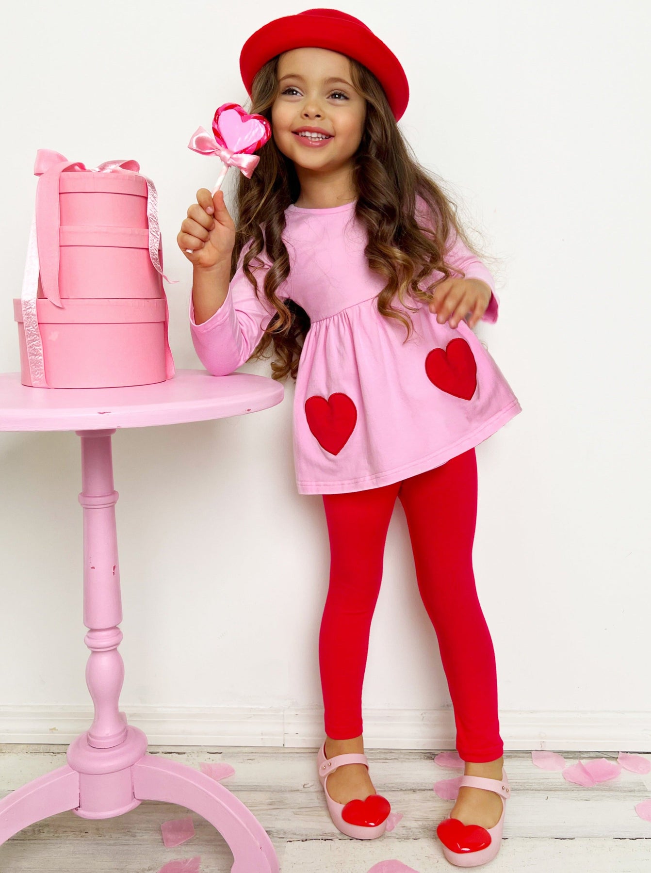 - A charming long sleeve top and legging set that’s blessed by Cupid’s bow! Your little girl will be hopping with joy in this pretty set that’s perfect for the season of love.