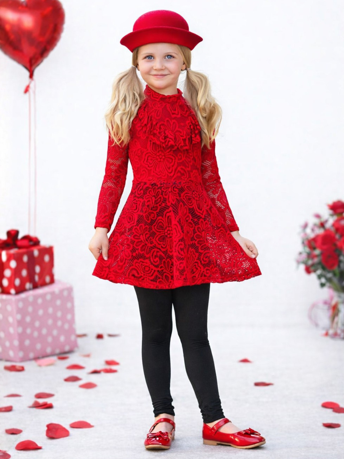 - Features a stunning red lace tunic with intricate floral patterns, perfect for capturing the magic of Christmas.