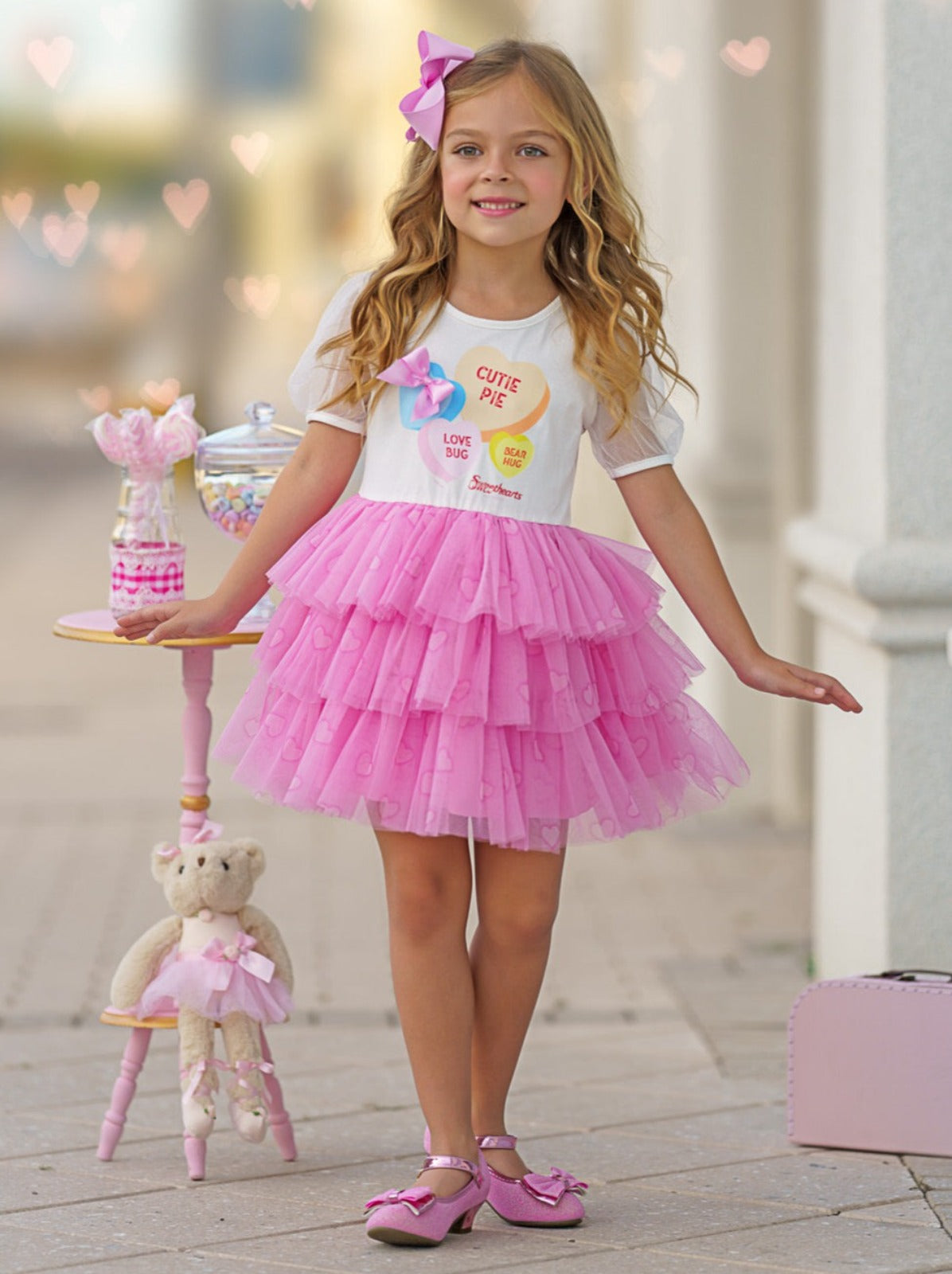 - Short sheer tulle sleeve tutu dress with multicolored Sweethearts® heart-shaped conversation candies graphic design bodice and tiered heart print tulle layered skirt