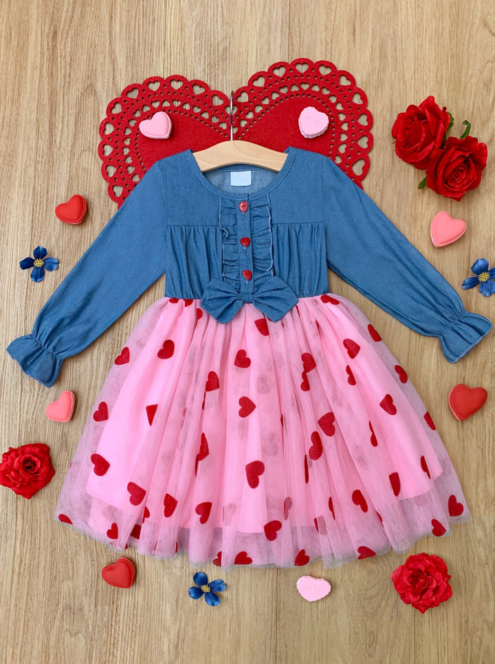 Long-sleeve chambray bodice tutu dress with heart button details, bow accent at waist, and heart felt pattern layered tulle skirt