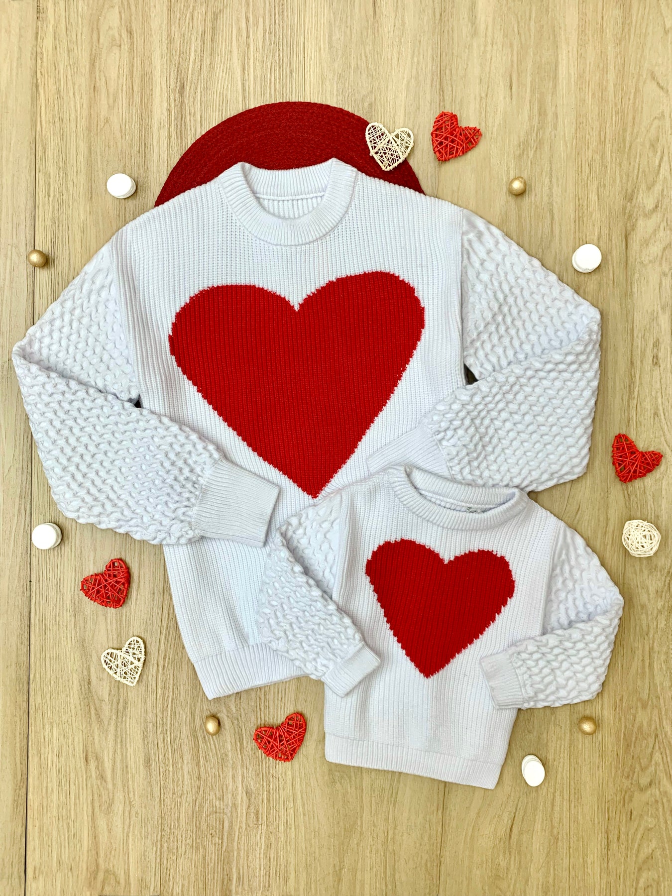 - Featuring a bold red heart on a soft white backdrop, this sweater blends charm and comfort effortlessly. The textured knit sleeves add a unique touch, making it a standout piece for Valentine’s Day or any day you want to share the love.