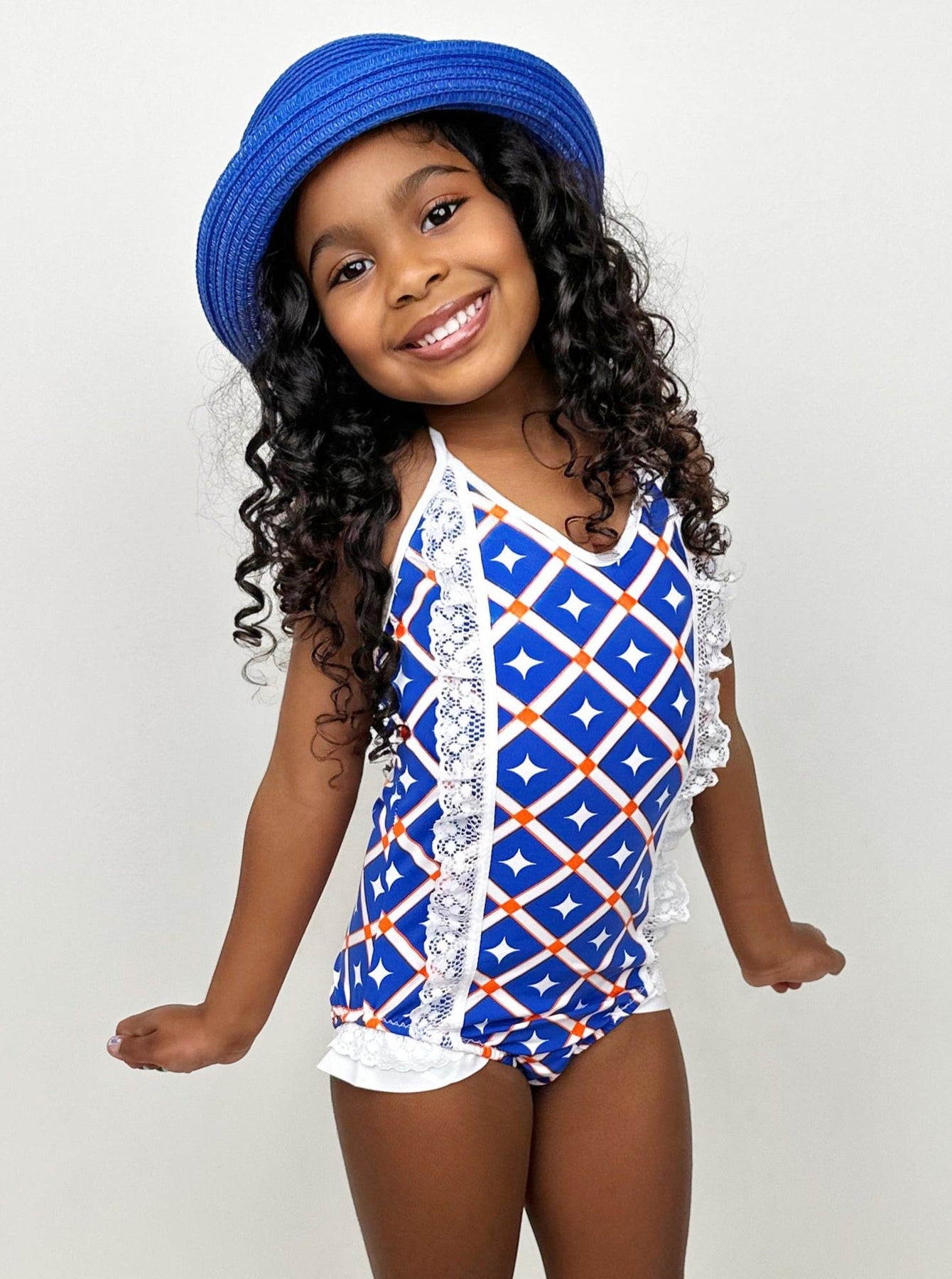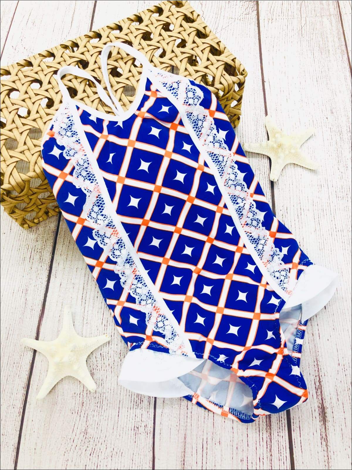 There will be no boring swimsuits on our watch! Give your little girl something unique to splash in with this geometric, lacey one-piece bathing suit! Colorful, chic, and cute as can be, she's sure to make a splash with all her friends!