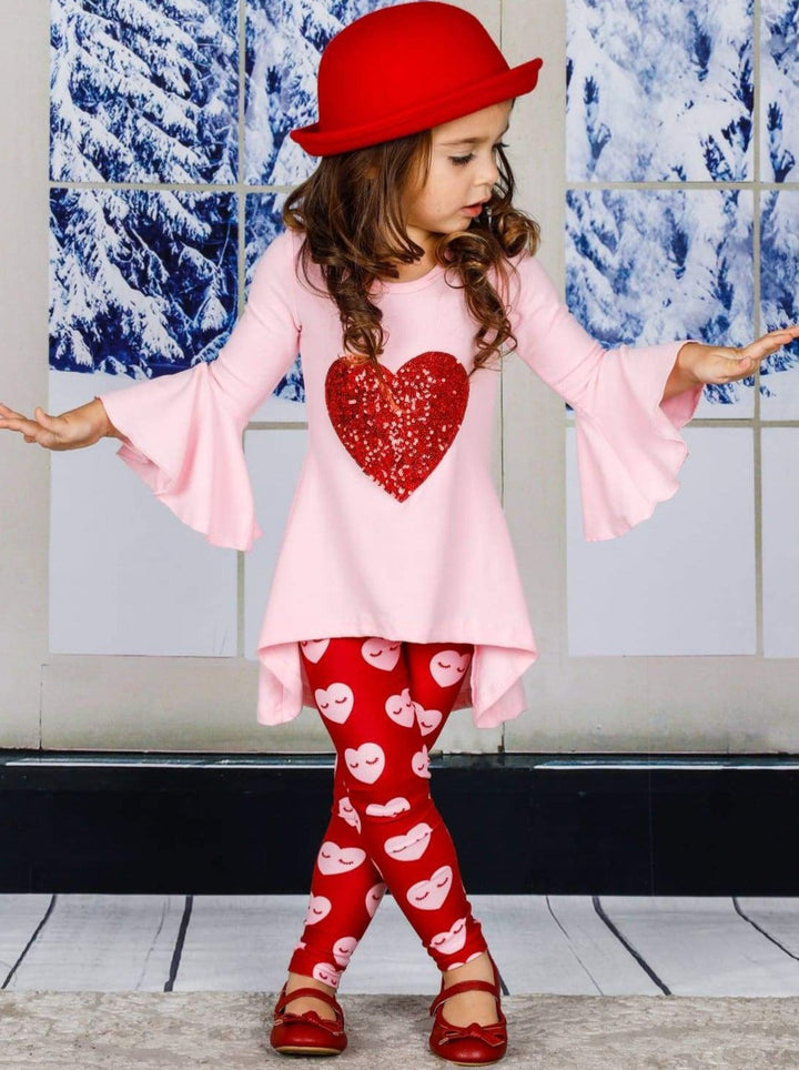 - The set features a hi-lo tunic with sequin heart applique with 3/4 length flounce sleeves and matching heart print leggings