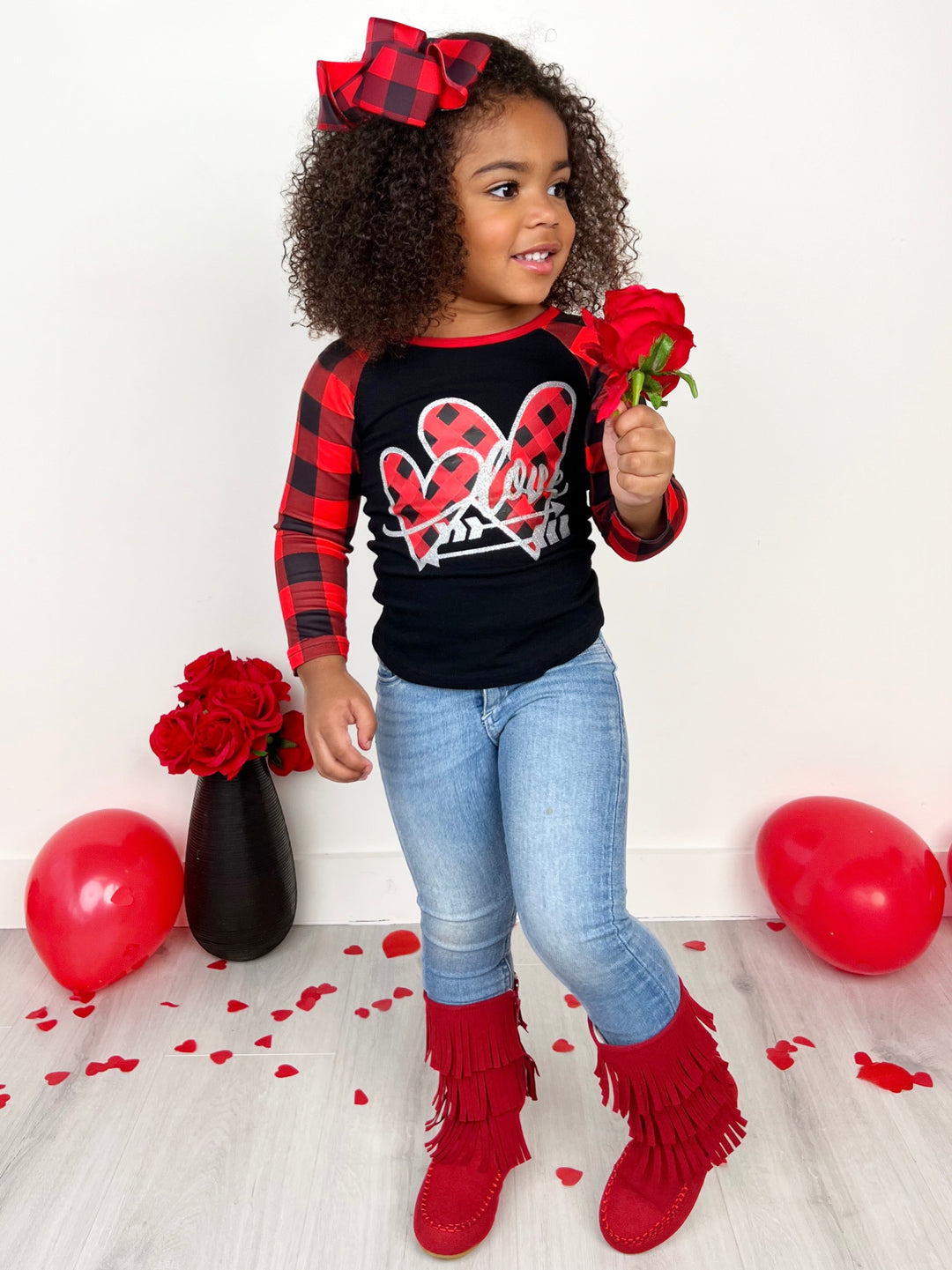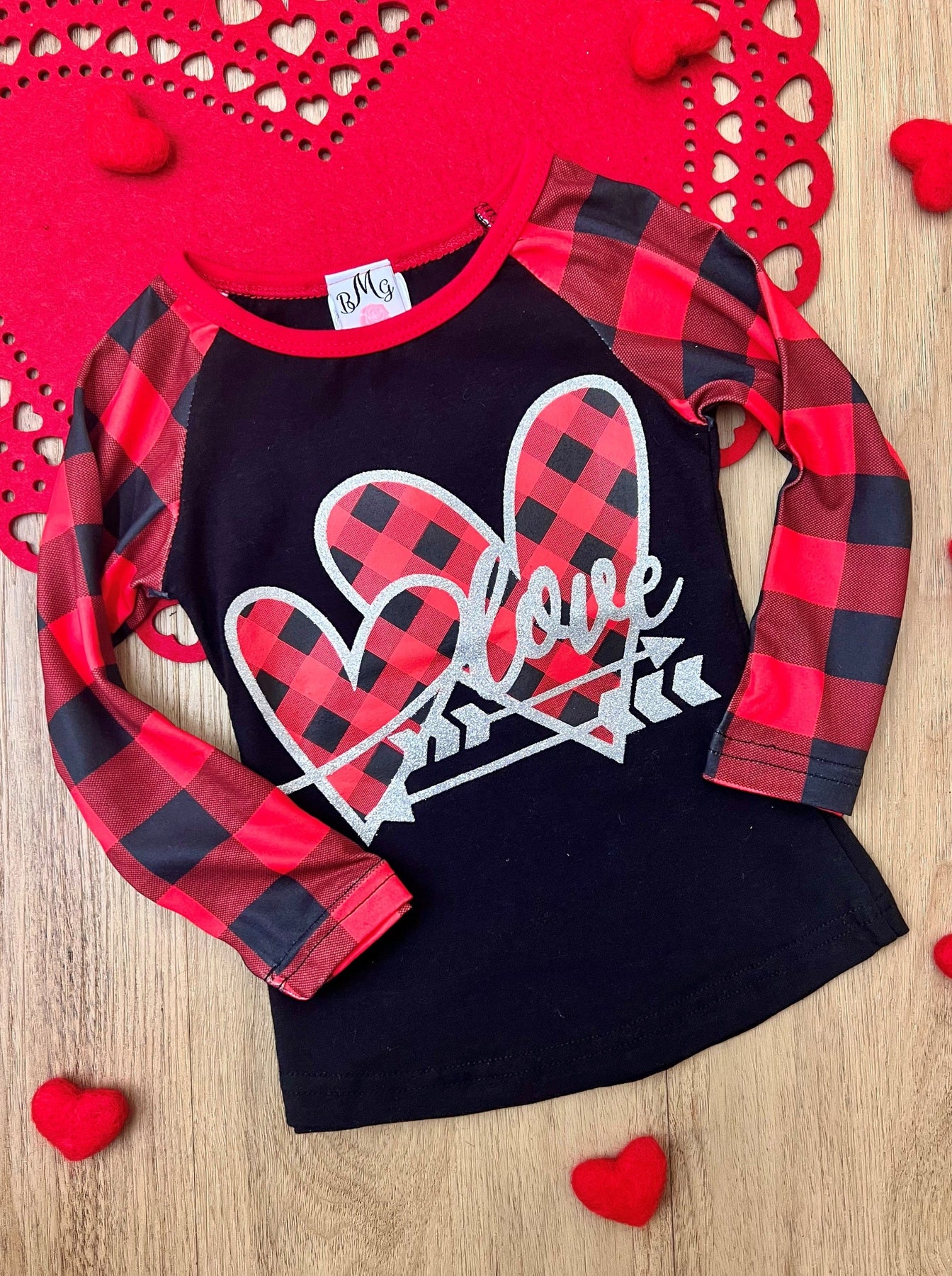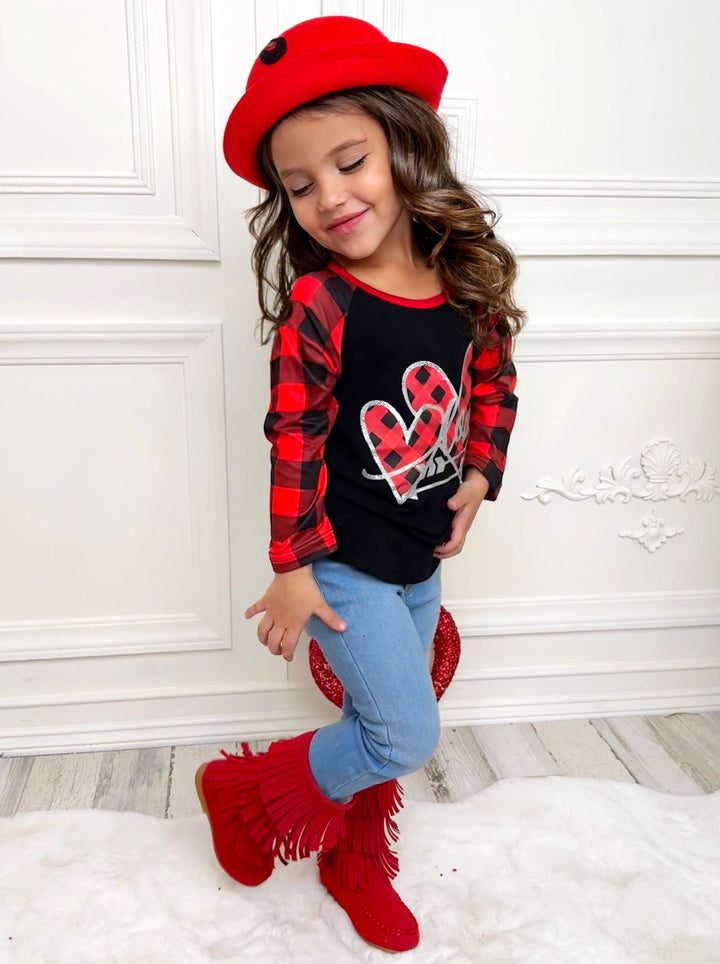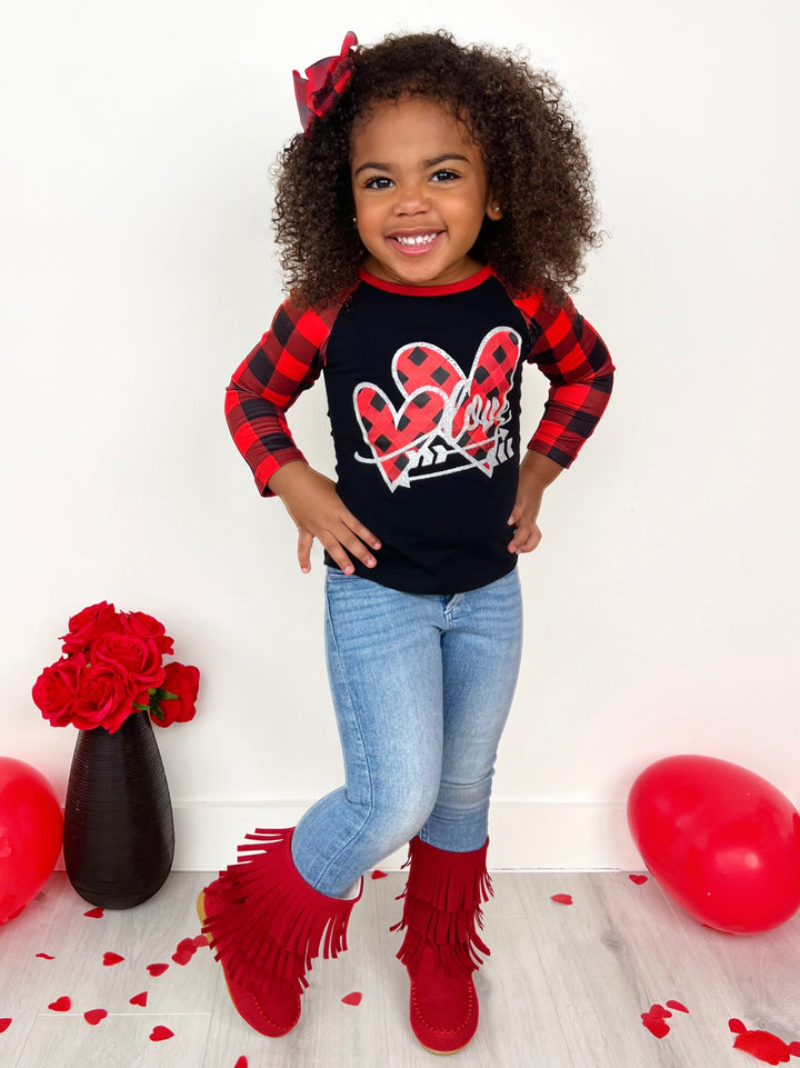 - Black long buffalo plaid sleeve raglan top with "LOVE" hearts and arrows graphic print