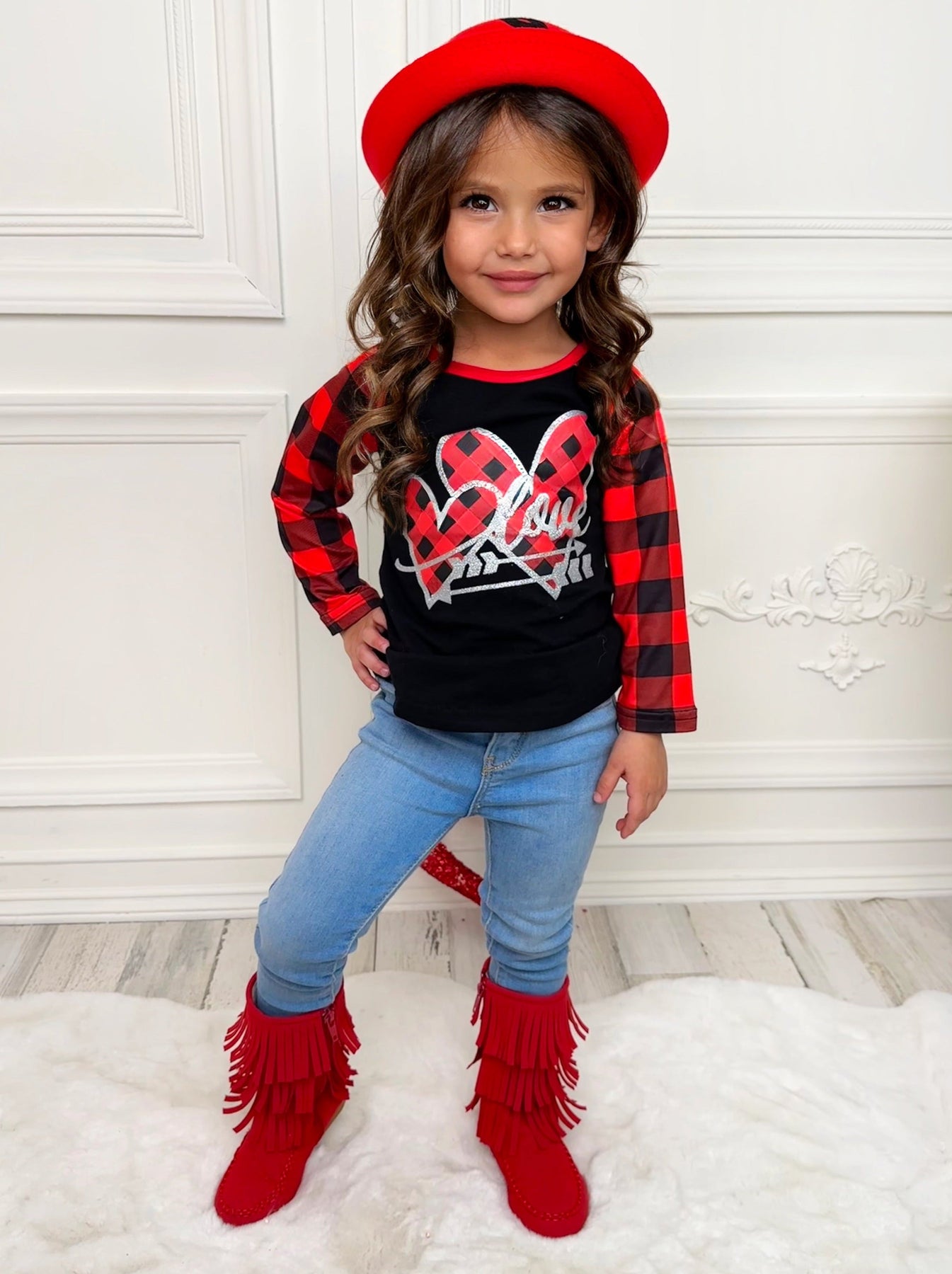 - With a darling design as sweet as the little loves who sport it, this 'Love' buffalo plaid raglan graphic top is brimming with cuteness overload that's ready for play. Boasting an easy slip-on fit, it makes changing into this sleek shirt a piece of cake for your lil' heartbreaker!