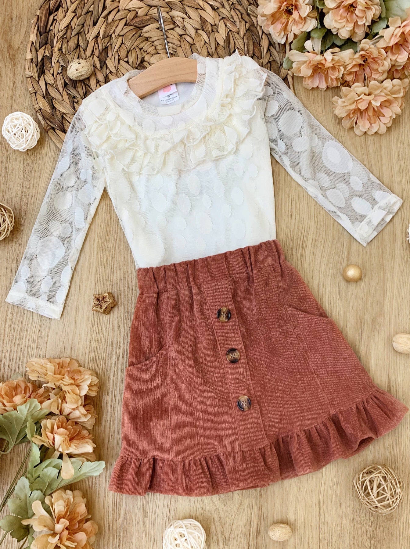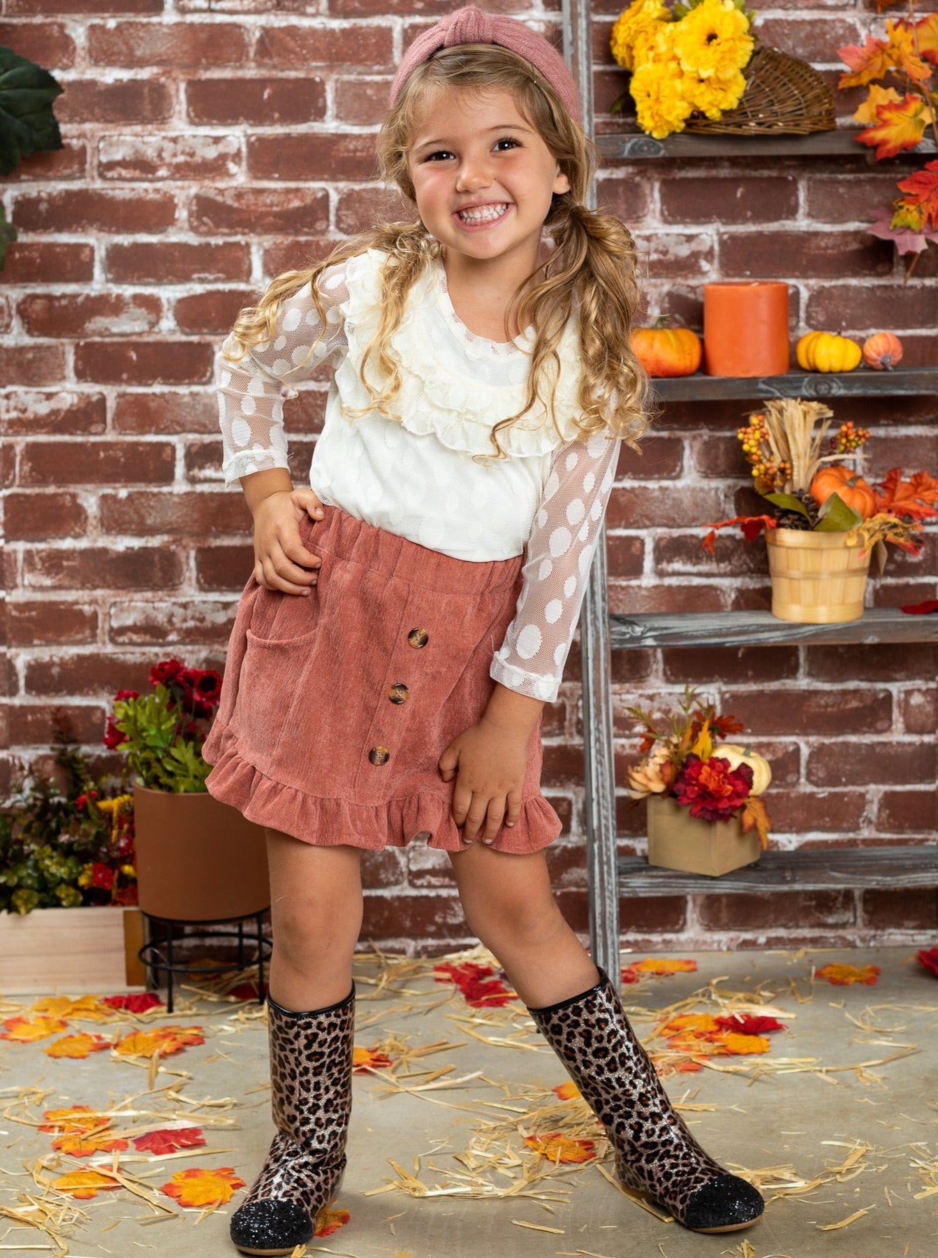 - Long-sleeve swiss tulle polka dot top with ruffle bib and faux button velvet skirt with ruffle hem and pockets