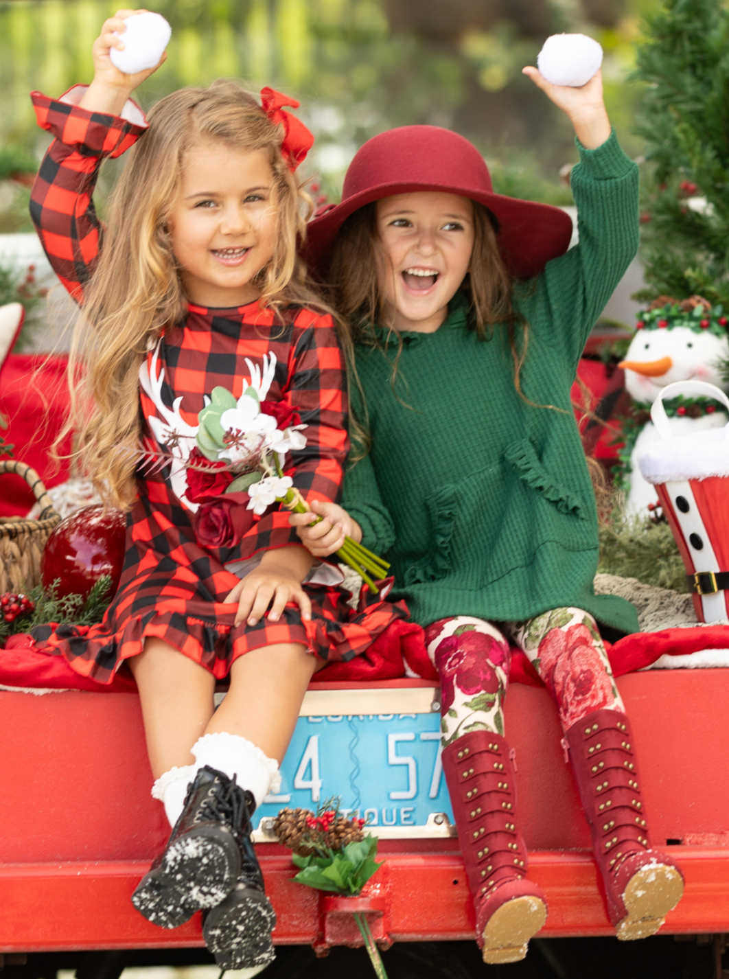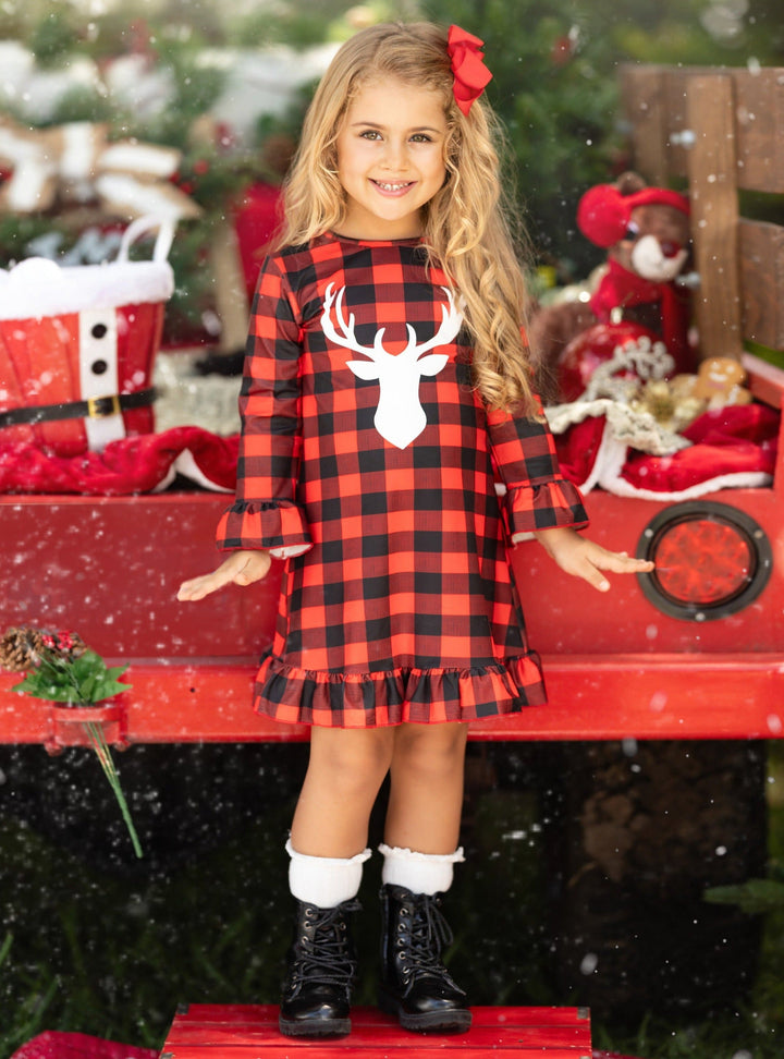 - This adorable plaid ruffle dress sports a reindeer silhouette perfect for leading your little girl to the head of the winter fashion pack. She'll love twirling and showing it off to family and friends.