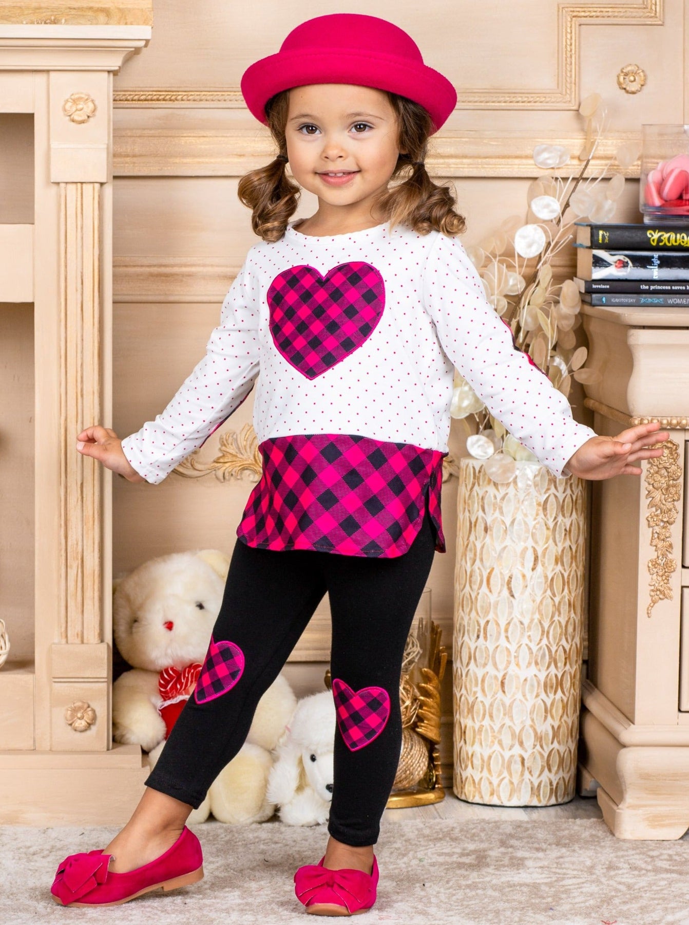 - Polka dots, plaid, and a pretty princess to go with them; sounds like a recipe for Valentine's Day adorableness. Your little girl will get lots of love in this cute and casual two-piece legging set featuring heart patches and a sleek, stretchy fit.