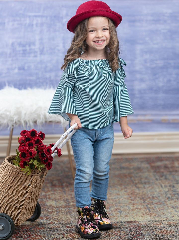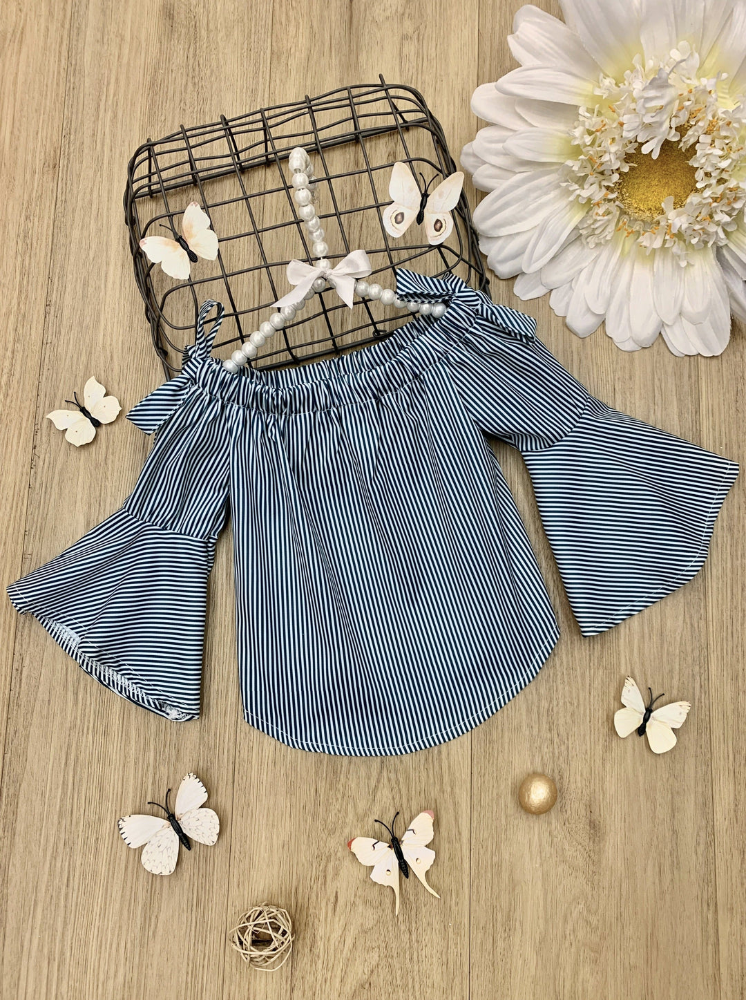 - Pinstripe cold-shoulder top with long flounce sleeves and adjustable bow accents