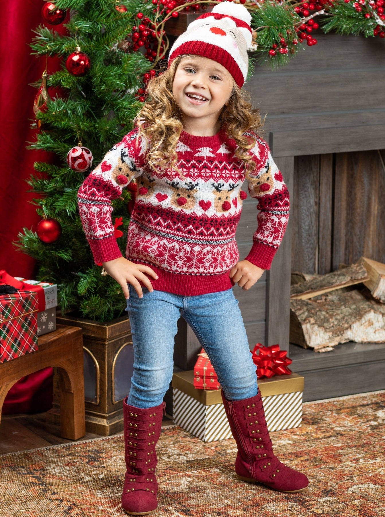 - Hearken to the merry bells of the season with this perfect sweater to keep her warm and cozy. Fuzzy and festive, it will have her ready for wrapping presents and baking with Grandma. Did you notice the pom-pom applique that makes up Rudolph's nose?