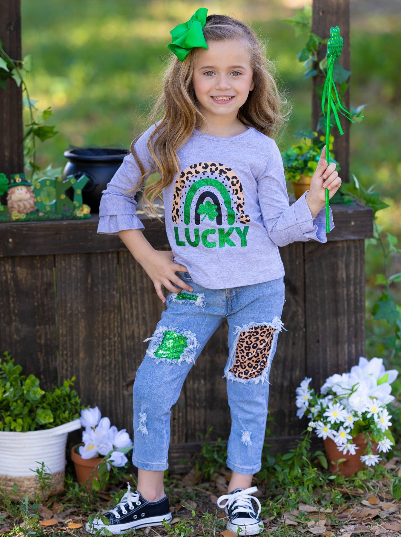 Forget pots of gold; your little lucky charm is the TRUE treasure at the rainbow's end. Dress her in this adorable bell-sleeve top and patched jeans set to help her inner glow shine through. With leopard print and hints of green sequin, the trendy distressed jeans will keep up with her St. Patty Day play.