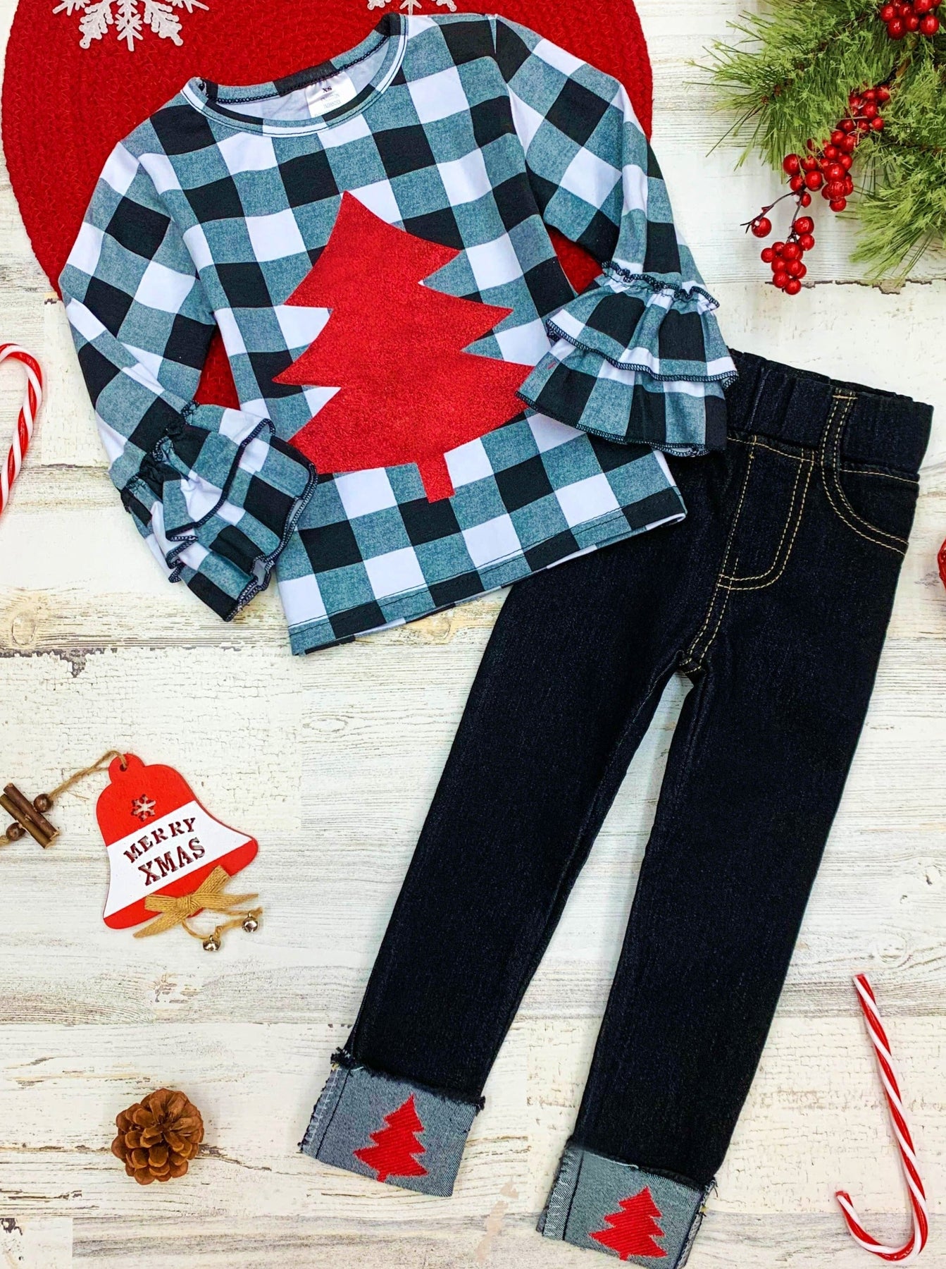 Cute Winter Sets | Girls Plaid Christmas Tree Top & Cuffed Jeans Set
