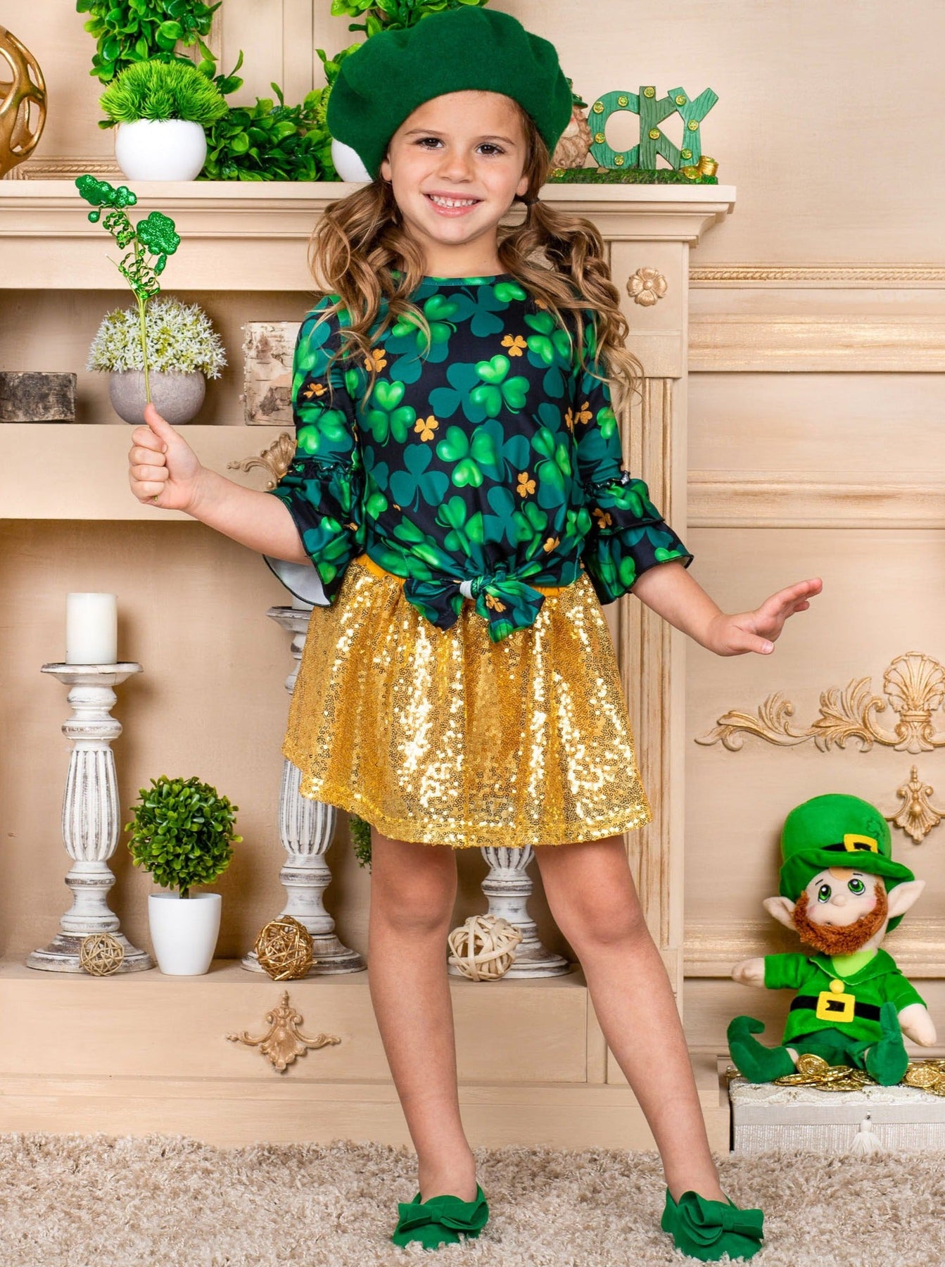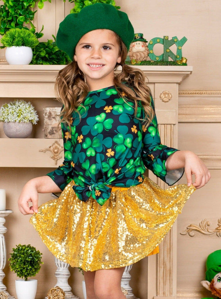 Add some shimmer to your shamrock shake in this magical knot hem top and sequin skirt set. Your mini maven will look like the pot of gold at the end of the rainbow with an all-over clover print top and golden mesh-knit atop the silky smooth skirt. Just the outfit for her St. Patrick's Day celebrations!
